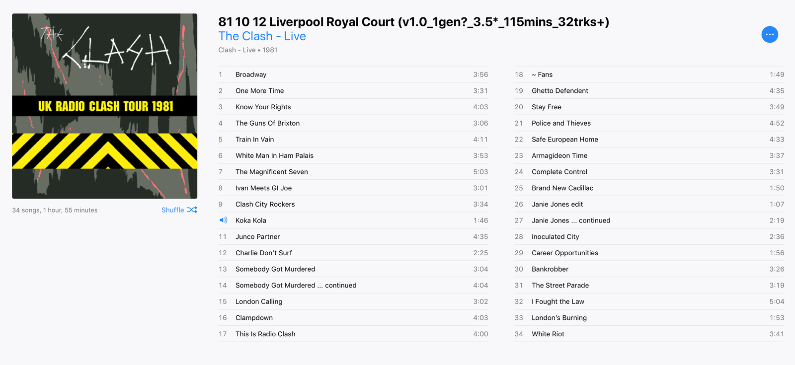 "Welcome to The Clash at the Royal Court Theatre, and it's been 3 years since we played at Eric's so we're glad to be back here, and anyway welcome to the show, hope you can hear, this is a new song" Know Your Rights keeps getting better and better with each performance, still ragged and unfinished but hard & fierce here. An edit goes into start of Guns of Brixton with some great jarring lead guitar. There are three short dropouts on a fine Train In Vain. "Alright, Everybody get on a train to Hammersmith, mind the doors" The audience sing-along to White Man in Hammersmith Palais and Joe adlibs impressively over the ending of a passionate performance.