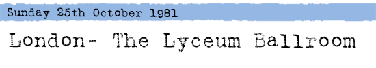 The audience cheer the band back for the first encore which begins after Joe asks "Hello is anybody shouting for anything?" as per usual at the Lyceum with a pumped up Safe European Home. An excellent Washington Bullets with Joe (and Mick) in great vocal form unfortunately is interrupted up by a tape turnover edit 2/3rd ‘s in. Moreover the blank tape Derek now used was of inferior quality so there is here on a drop in high frequency quality particularly in the left channel; all making for a flatter less dynamic sound. After a lengthy instrumental extended ending it's straight into Revolution Rock but it is a rather disappointing performance compared to the one on the 22nd, shorter and rather fizzles out at the end. Mick's Stay Free next is fine but his lack of interest in his guitar tonight is evidenced by his minimal contribution over the ending. "Alright then this is a 1981 number written in 1902!" and the band launch into Career Opportunities; bringing the encore to an end on an adrenalin rush.
