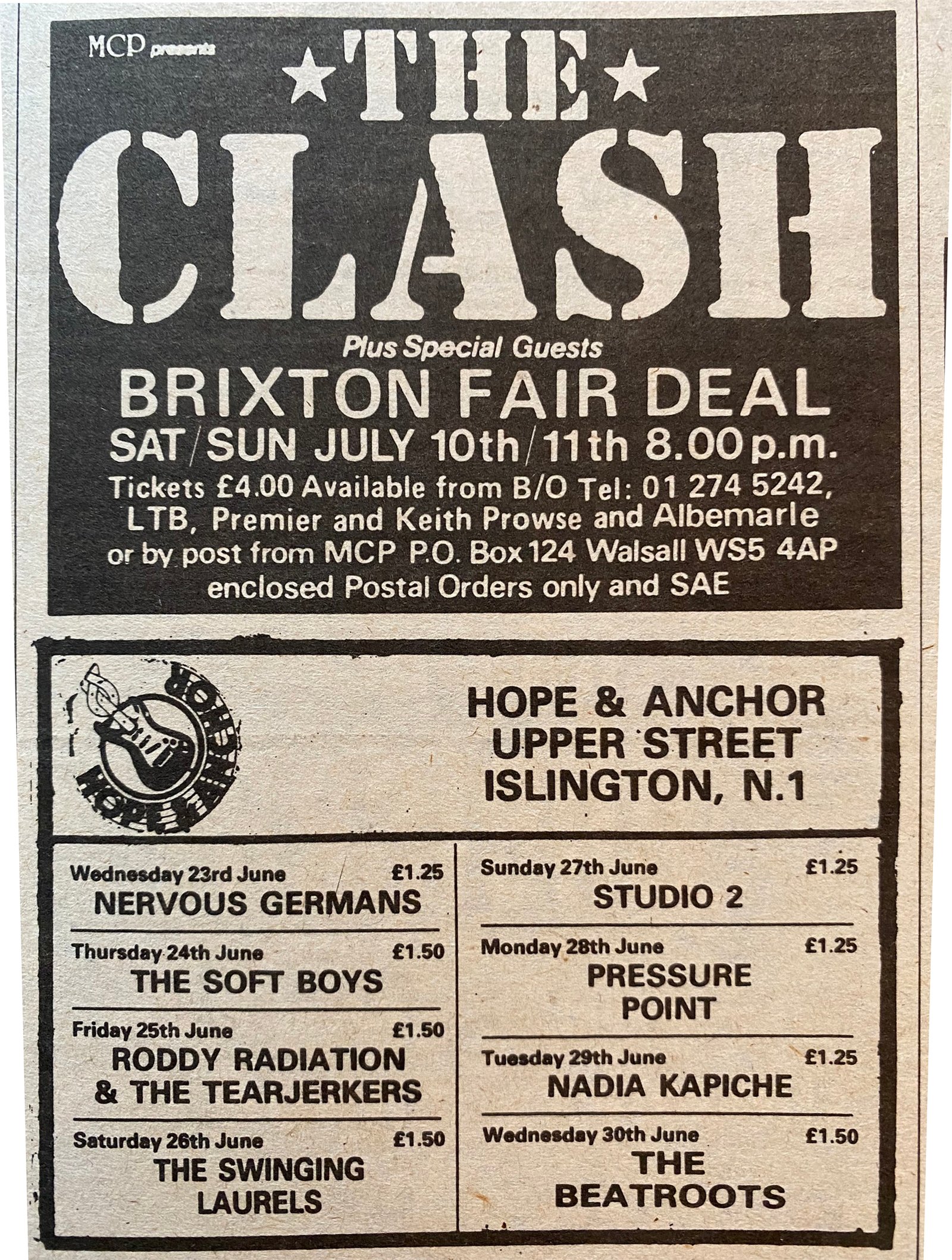 The tour was enough of an event for the national tabloid the Daily Mirror to cover the Brixton shows (10th or 11th is unclear). Simon Kinnersley's piece [link] is largely positive with some insight, "Many of their songs are performed in a maelstrom of jagged guitar chords, frenzied rhythms amidst shouting from vocalist Joe Strummer. Yet far from detracting from the show, the general mood of musical chaos seems to increase the excitement still further."