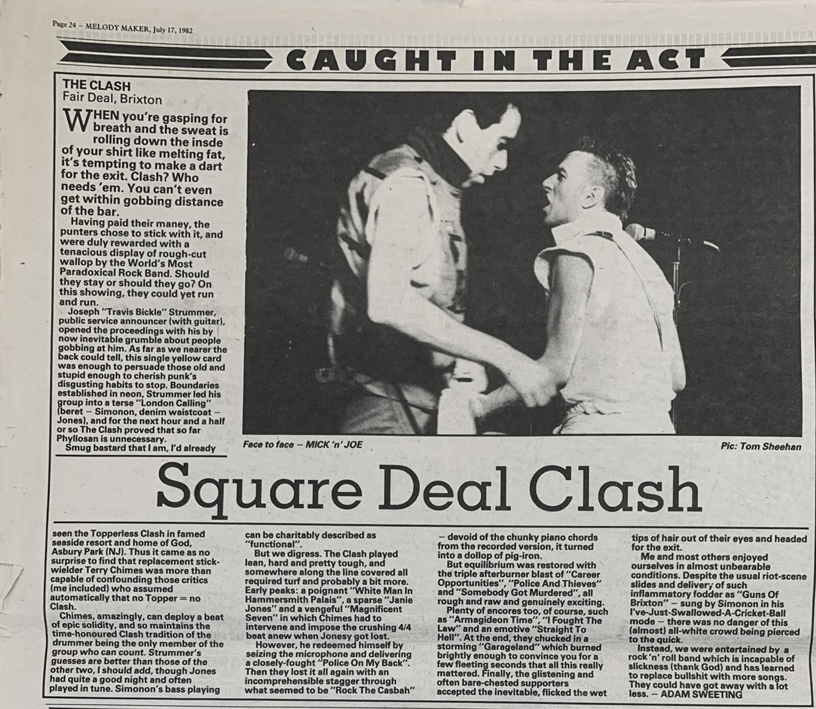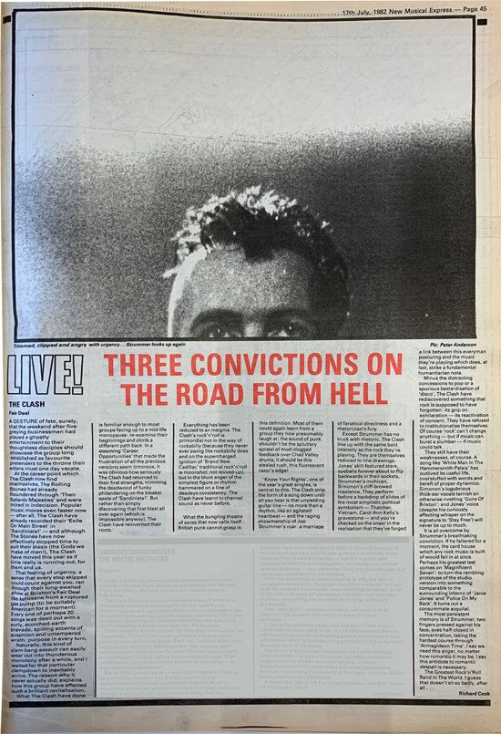 Adam Sweeting, today an established journalist of note, writing then for the Melody Maker emphasised the heat in the venue on a hot July night, "sweat rolling down, gasping for air". His positive if sarcastic piece describes a " tenacious display of rough cut wallop by the World's Most Paradoxical Rock Band" He said Strummer's opening grumble about gobbing worked and said Terry was able to keep a beat, Jones often played in tune! Richard Cook's glowing and eloquent review in the NME appears to have been of the extra Brixton show on 30th July.