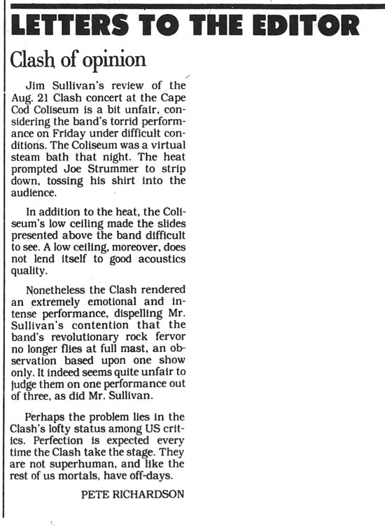 A show I will never forget From: richard haley I was there in 82. My friends truck broke down on the way there, so we jumped in the back of another truck at a rest stop and got a ride to the show. We arrived and everyone went there own way. I wound up on the floor up front. When the b52s came on stage, everyone started throwing their beers at them, they ran off stage. The lights came on and everyone up front who threw their cup moved back. I moved up and the lights went off and The Clash came on and what a night it was. Saw the concert and when over, I exited the Coliseum and found myself under a sign that said " Boston" 72 miles. I got a ride and we picked my friend up about 42 miles up the road and he remembered where his truck was and that was my night with the clash, a show I will never forget.
