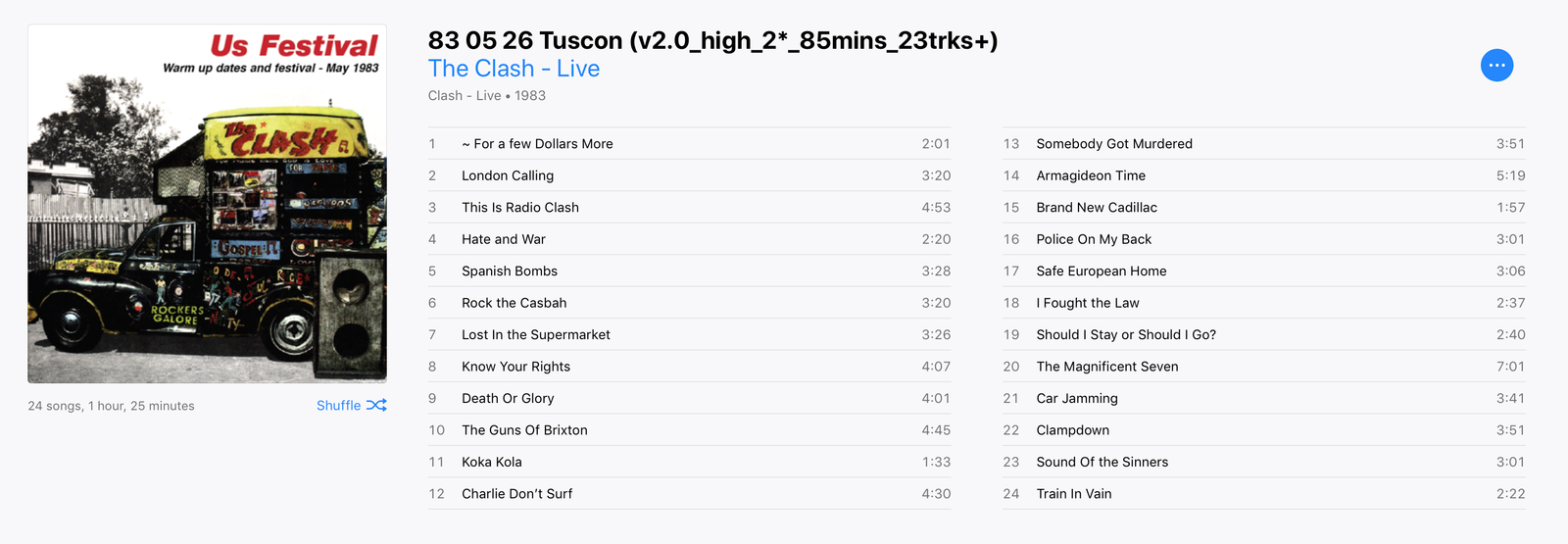 great site! i found it while looking for the set list of the Clash show in Tucson, AZ in may 83.