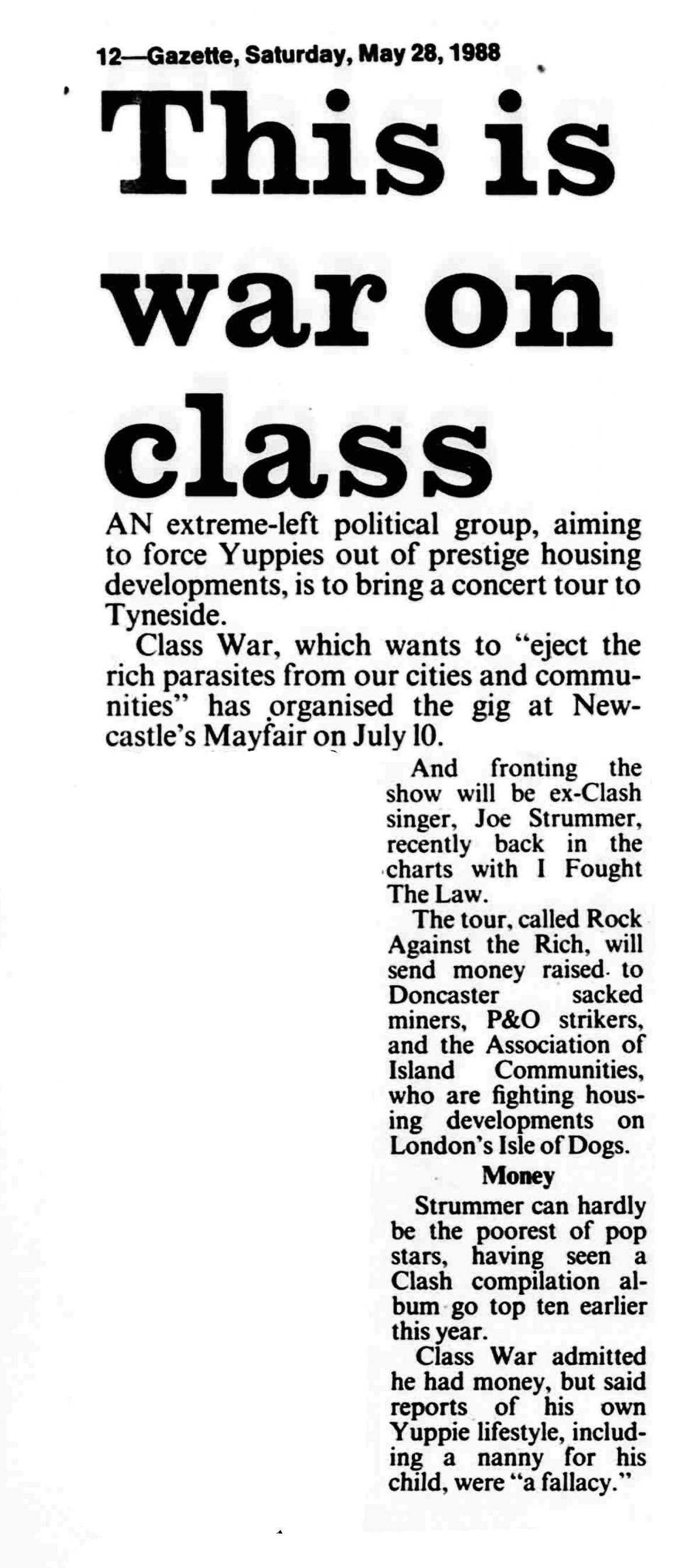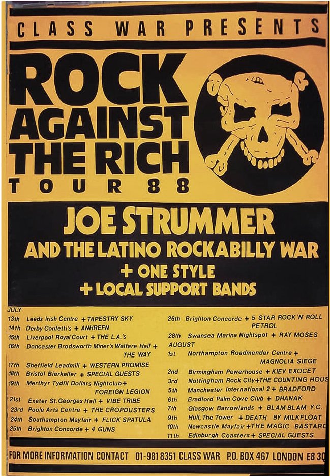 The tour-organized in support of the anarchist group Class War-was often met with resistance: several venues refused bookings, and some shows were canceled due to poor ticket sales or political pressure. Nevertheless, Strummer was undeterred, stating,