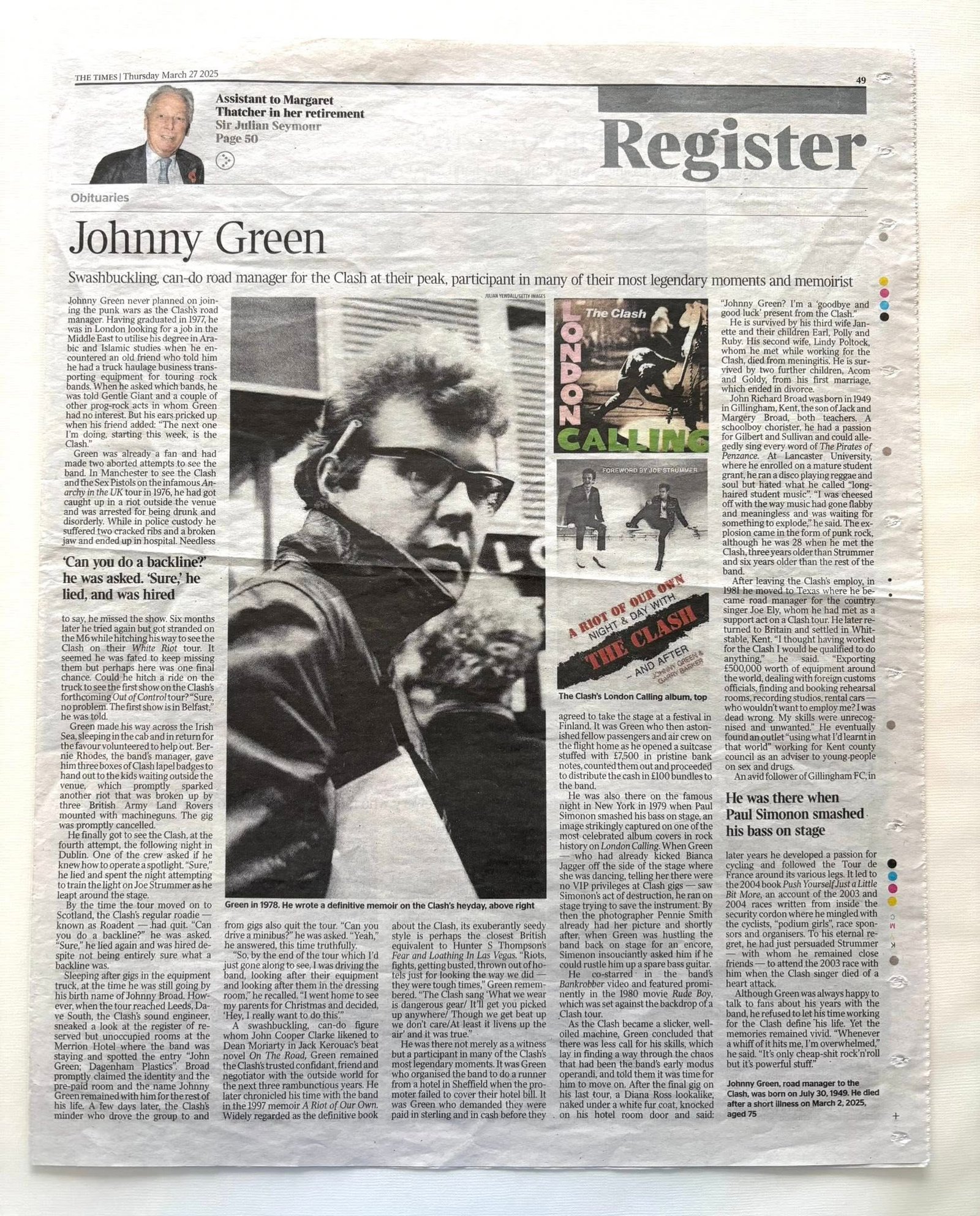 Johnny Green, road manager to the Clash, was born on July 30, 1949. He died after a short illness on March 2, 2025, aged 75