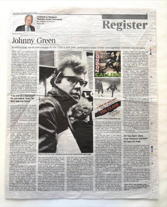 Farewell to Mr Johnny Green, former Clash Roadie...
