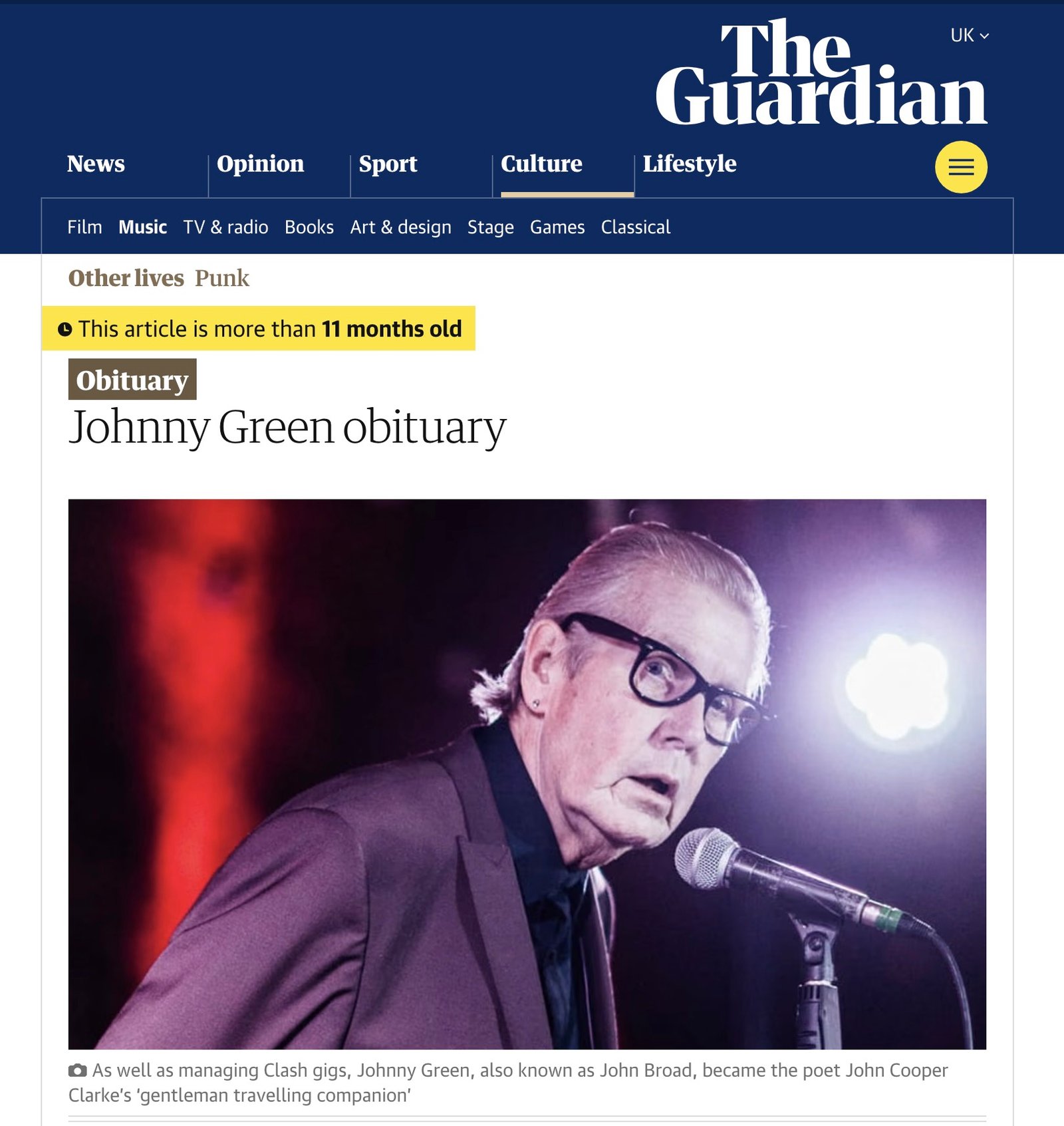 Obituary of Johnny Green, Clash road manager and writer, recalling punk-era adventures, later work with John Cooper Clarke, teaching career, personal tragedies, and enduring legacy as storyteller, family man, and cultural figure.