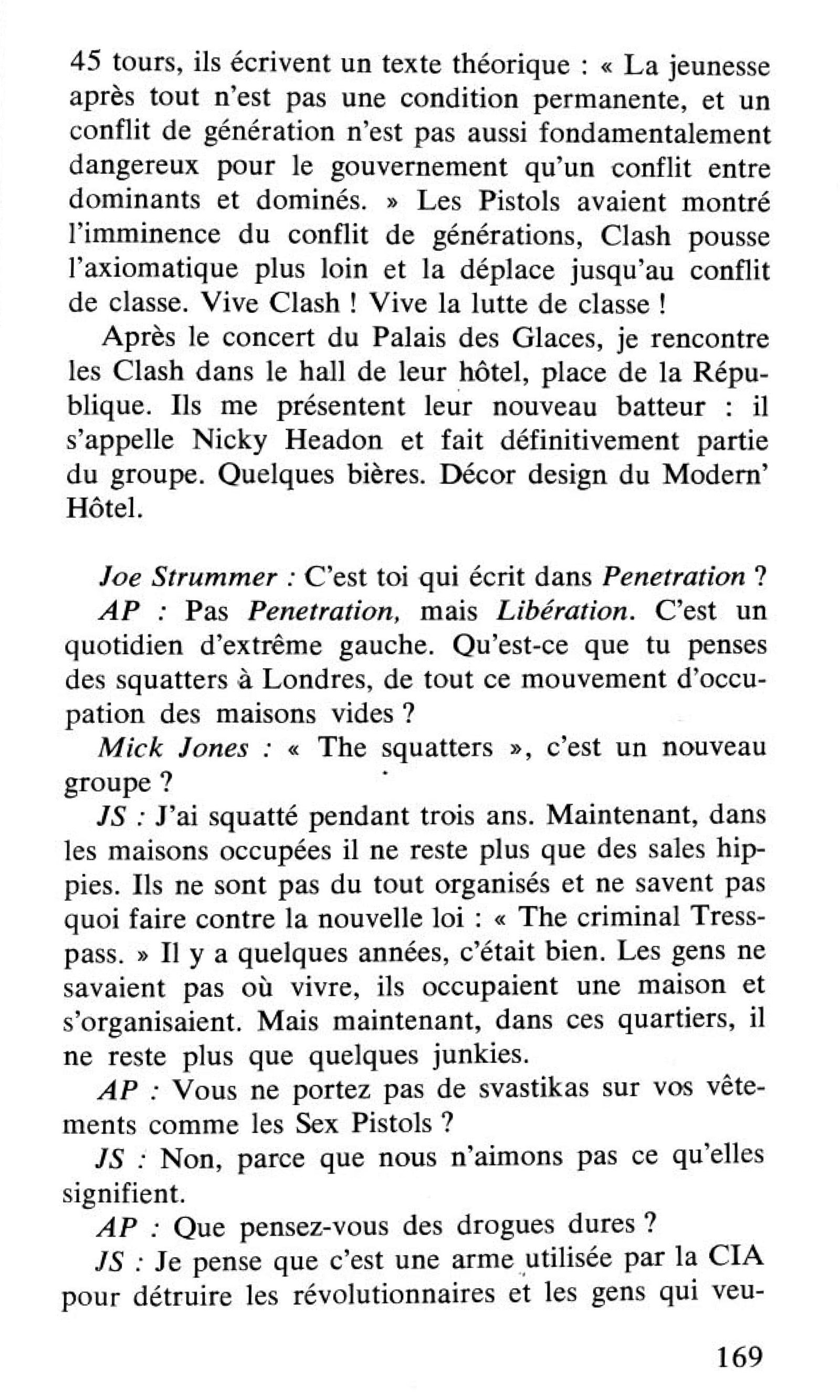 Ensuite, Clash, le groupe le plus politisé de la nouvelle scène anglaise. En avril 76, le manager des 101 ers vint me voir à Libé. On lui avait parlé à Londres d’un mec qui écrivait des articles sur le punk dans un canard gauchiste. Malheureusement, je n’étais pas là et il me laissa un petit paquet avec des photos du groupe, des revues de presse et une cassette avec la maquette de leur prochain album. Je Técoutai le soir. Quelle claque ! Enfin un bon groupe de rock’n roll, avec des morceaux tous originaux qui swinguent et sur lesquels on a envie de danser ; Keys to your heart, leur single, Leavin Suck City, Petrol, Rabies, Steamgange 99, Moto Boys Heart, des thèmes d’inspiration urbains et teens. Ils avaient formé un groupe à Paddington, un quartier de Londres réputé pour ses trains : le 101 ers. Joe Strummer, leur guitariste, est obsédé par le rythme des voies ferroviaires : « Une fois que vous avez ce rythme qui fait cliqueti-clac dans le sang, vous ne serez plus jamais le même. » Le groupe comprend en plus de Strummer Tall « Snake Hips » Dudansky à la batterie. Clive W.M. Timperlee à la guitare, « Desperate » Dab De Bass au piano. Pendant plus d'un an, ils écument le circuit des pubs londoniens, reprenant avec de grandes libertés des classiques du rock’n roll ou jouant leurs morceaux à eux. Ils vivent dans des maisons squattérisées, ce qui fait qu’ils ont souvent joué pour défendre cette cause. Un jour, au Nashville de Kensington, les Pistols jouent trois morceaux à une première partie des 101 ers. Ils se font descendre par toute la presse : « Les Pistols font autant pour la cause du rock’n roll que la deuxième guerre mondiale avait fait pour la cause de la paix », écrit Allan Jones après le concert. Pourtant dans la salle, il y a Mick Jones qui fait partie des London SS, un groupe qui n’ose pas encore monter sur scène (Tony James, basse. Brian James, guitare, et Rat Scabbies, baterie), et Paul Simonon qui appartient au Bromley Contingent, ce premier noyau de fans des Pistols. Avec Joe Strummer, qui dès qu'il a vu les Pistols décide de dissoudre les 101 ers, nos trois guitarheroes vont former un groupe : ce sera Clash. Aussitôt, Bernard Rhodes leur propose de devenir leur manager, Bernard imprimait des t-shirts pour Malcolm McLaren à la boutique « Sex » de Londres. Il n’y a pas encore de batteur définitif. Ensuite, les premiers concerts, puis le Punk Festival au Club 100, où ils se font remarquer par la presse à cause de leurs chemises dégoulinantes de couleurs dans le style de l’action-painting proche de Pollock, et surtout de leurs lyrics qui expriment les aspirations d’un groupe radical. Bientôt, les Pistols se font virer de EMI puis de A et M. La presse commence à se désintéresser d’eux, il y a une place à prendre sur le devant de la scène et Clash signe pour une forte somme avec CBS, sort un single et prépare un album. « Attention les Pistols, les Clash arrivent ! » Les Clash vont faire prendre un tournant au punk en en radicalisant le discours et la musique. Les Pistols avaient poussé le punk vers une voie suicidaire, avec leur arsenal de croix gammées et leur position plus qu’ambiguë sur la place de la jeunesse dans le combat contre la bourgeoisie. Avec les Clash s’effectue un retour à une optique plus politisée. Ils ont assimilé le marxisme et prêchent la guerre urbaine, la lutte des classes. « Nous sommes antifascistes, antiracistes, et non-violents. Nous cherchons à éduquer les kids qui viennent à nos concerts pour les empêcher de s’inscrire au Front National si la situation politique se dégradait. Nous avons conscience que les jeunes jamaïcains expriment leur haine du colonialisme par le reggae, que les Noirs se révoltent contre l'impérialisme US par le free-jazz, mais nous sommes de jeunes prolétaires blancs et c’est par le rock que nous exprimons notre haine de la bourgeoisie ! Avant, nous traînions toute la nuit dans les bars, buvions des pintes de bière et nous battions avec les kids dans les pubs avant d’aller démolir les cabines téléphoniques de King's road. Maintenant, nous faisons un groupe de rock’n roll et les gosses qui viennent nous voir prennent leur pied et ne vont plus se saouler la gueule ! », déclare Joe Strummer. Leur 45 tours est un hymne à 1977, sur une musique urbaine, violente, radicale.