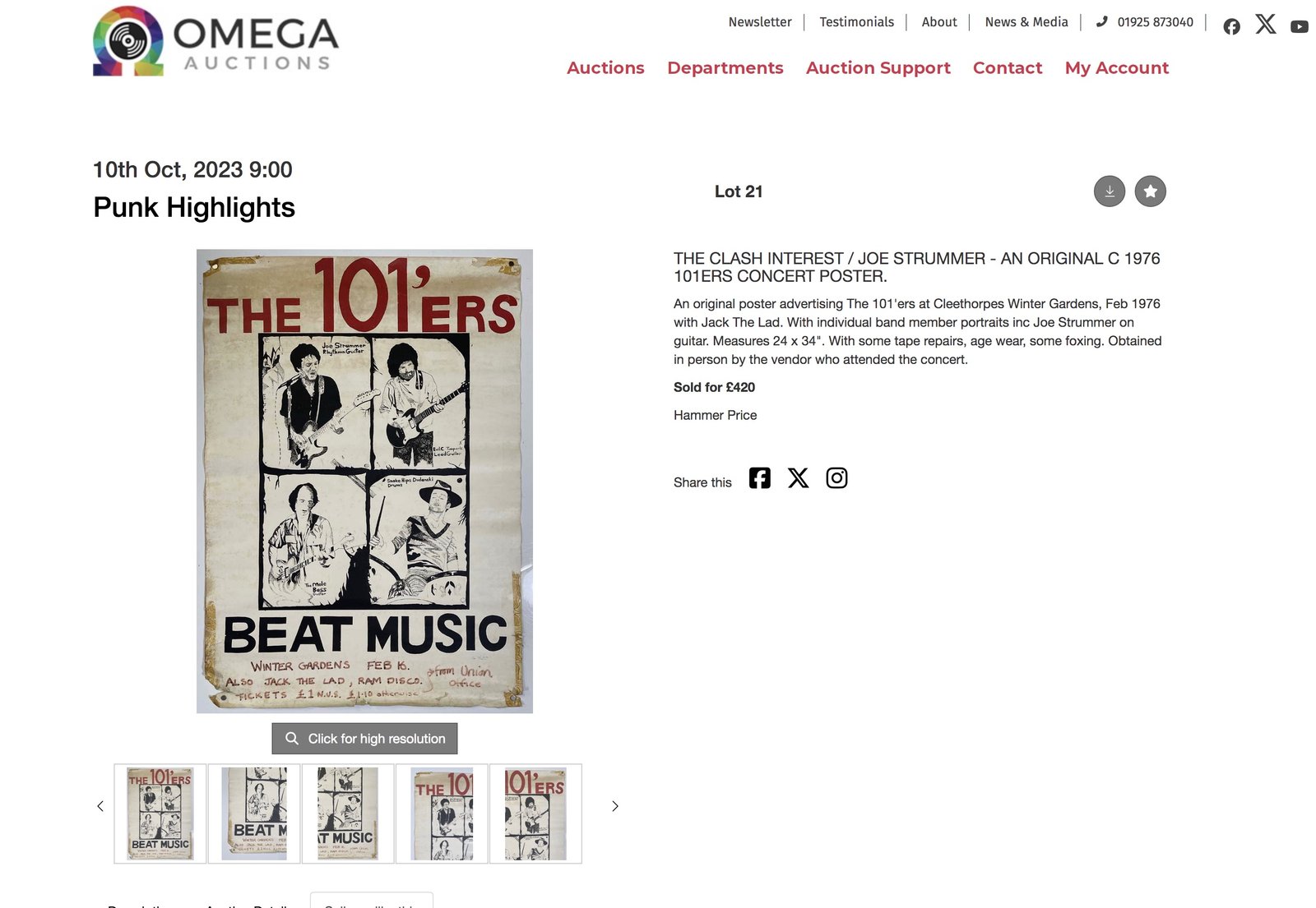 An original poster advertising The 101'ers at Cleethorpes Winter Gardens, Feb 1976 with Jack The Lad. With individual band member portraits inc Joe Strummer on guitar. Measures 24 x 34". With some tape repairs, age wear, some foxing. Obtained in person by the vendor who attended the concert.