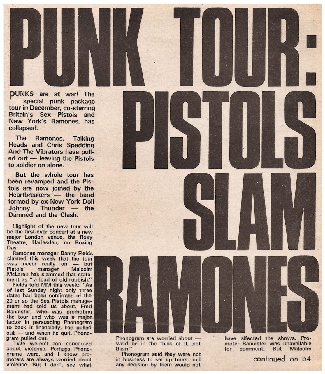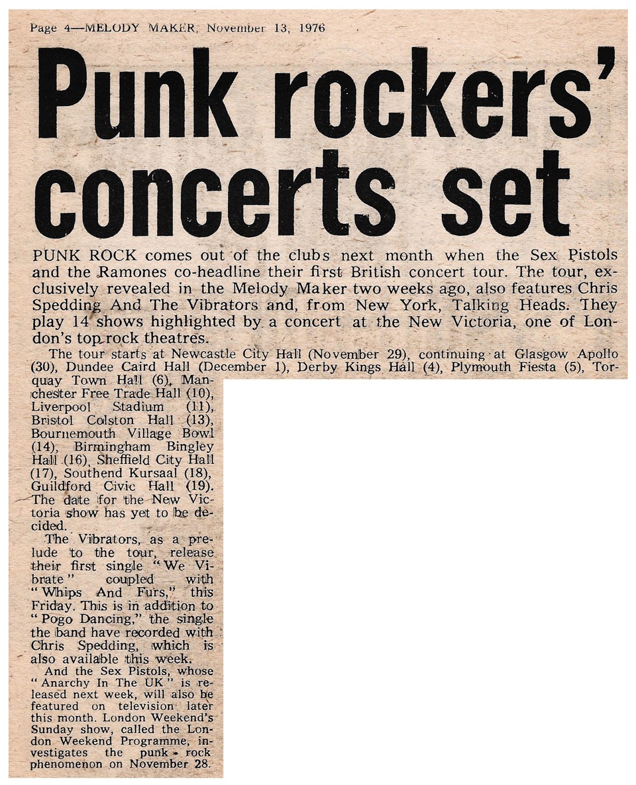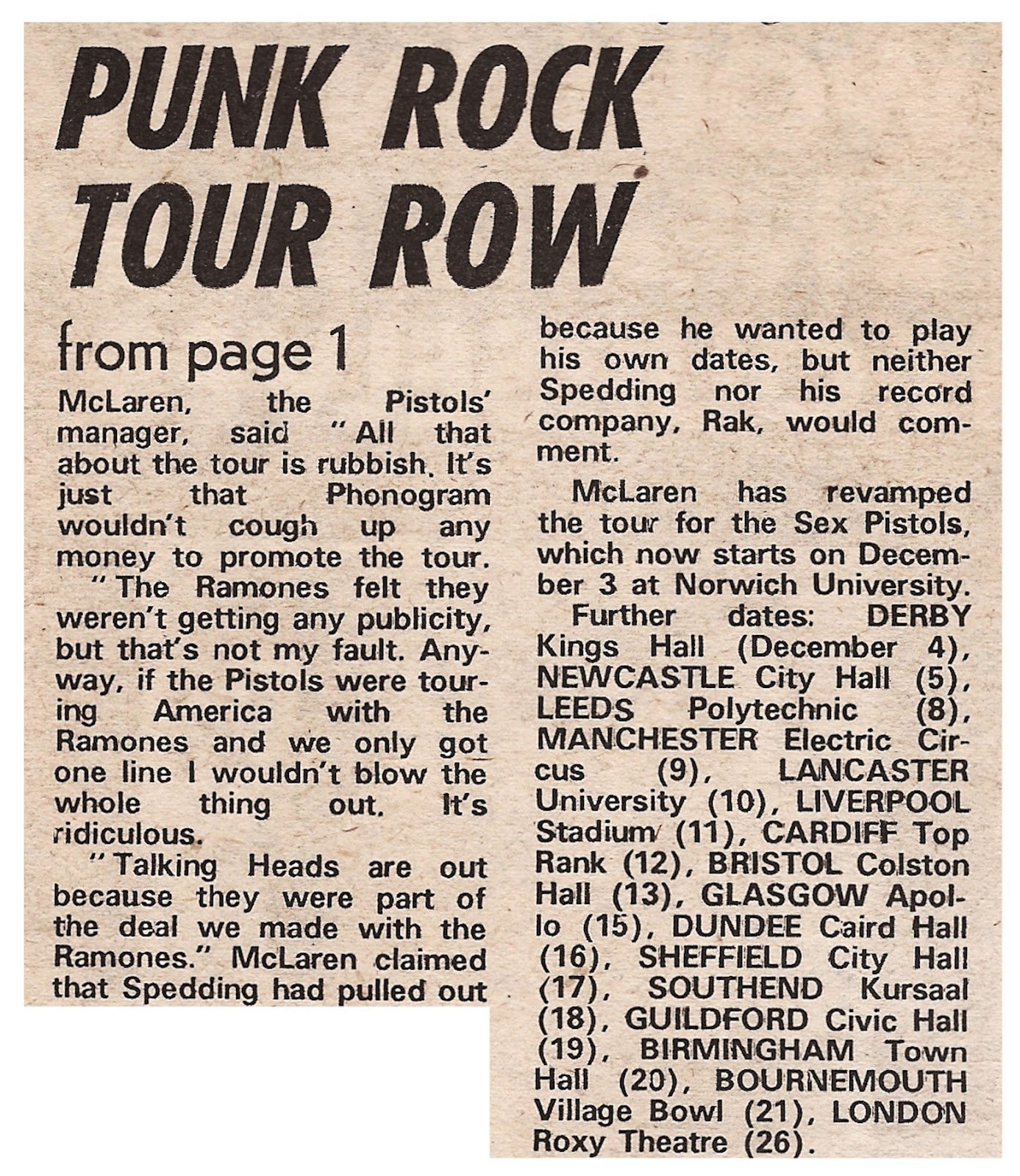 On 13th November 1976 the music press published details of a punk tour to be co-headlined by Sex Pistols and The Ramones, with Talking Heads, Chris Spedding & The Vibrators the other acts.
