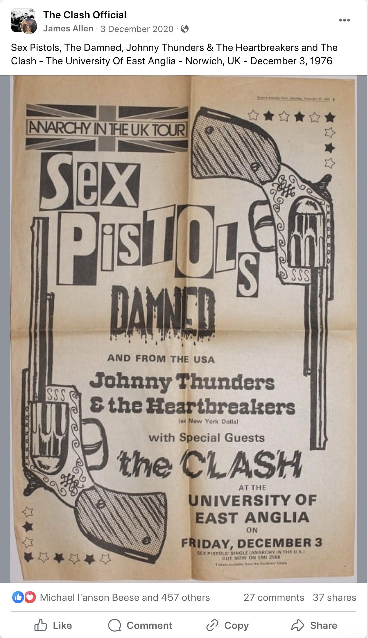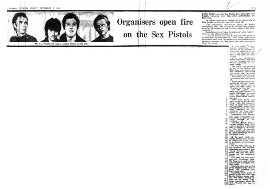 [extract] "The first stop on the Anarchy Tour was due to take place in the main hall of the University of East Anglia (UEA) on Friday 3 December. Along with the Sex Pistols, other groups sharing the bill were the Clash, the Damned and the Heartbreakers. In response to the Grundy show the Norwich local press bombarded the UEA with questions as to whether the concert would go ahead.