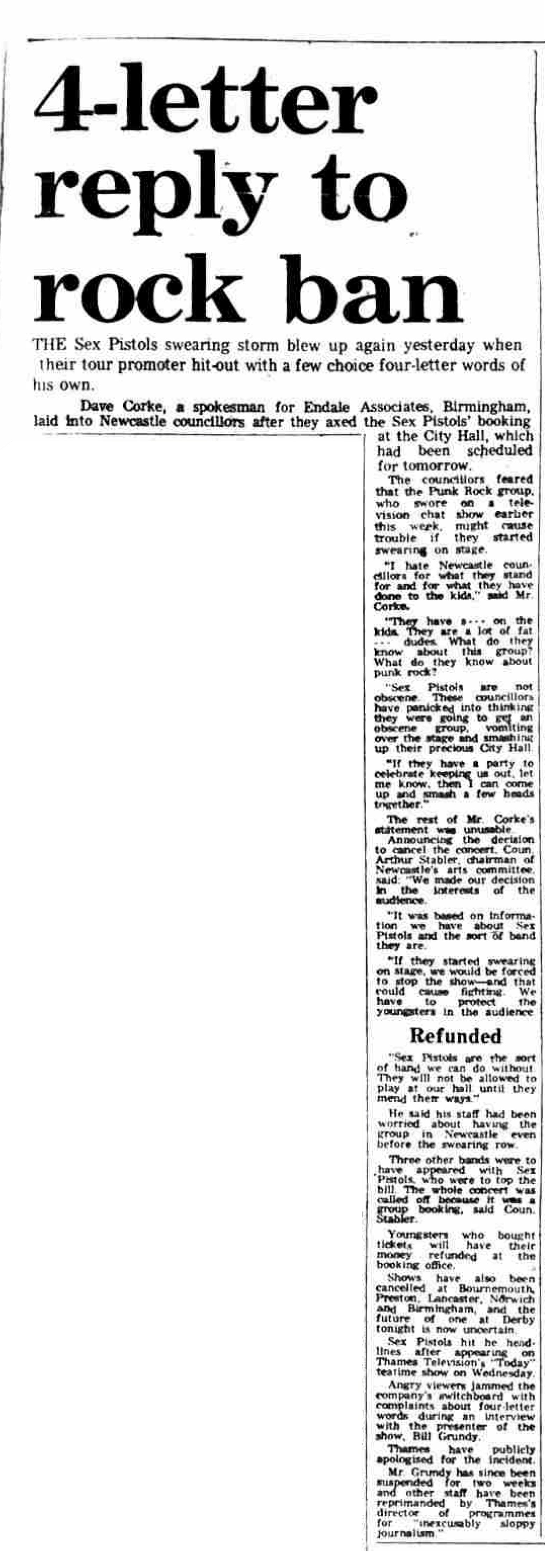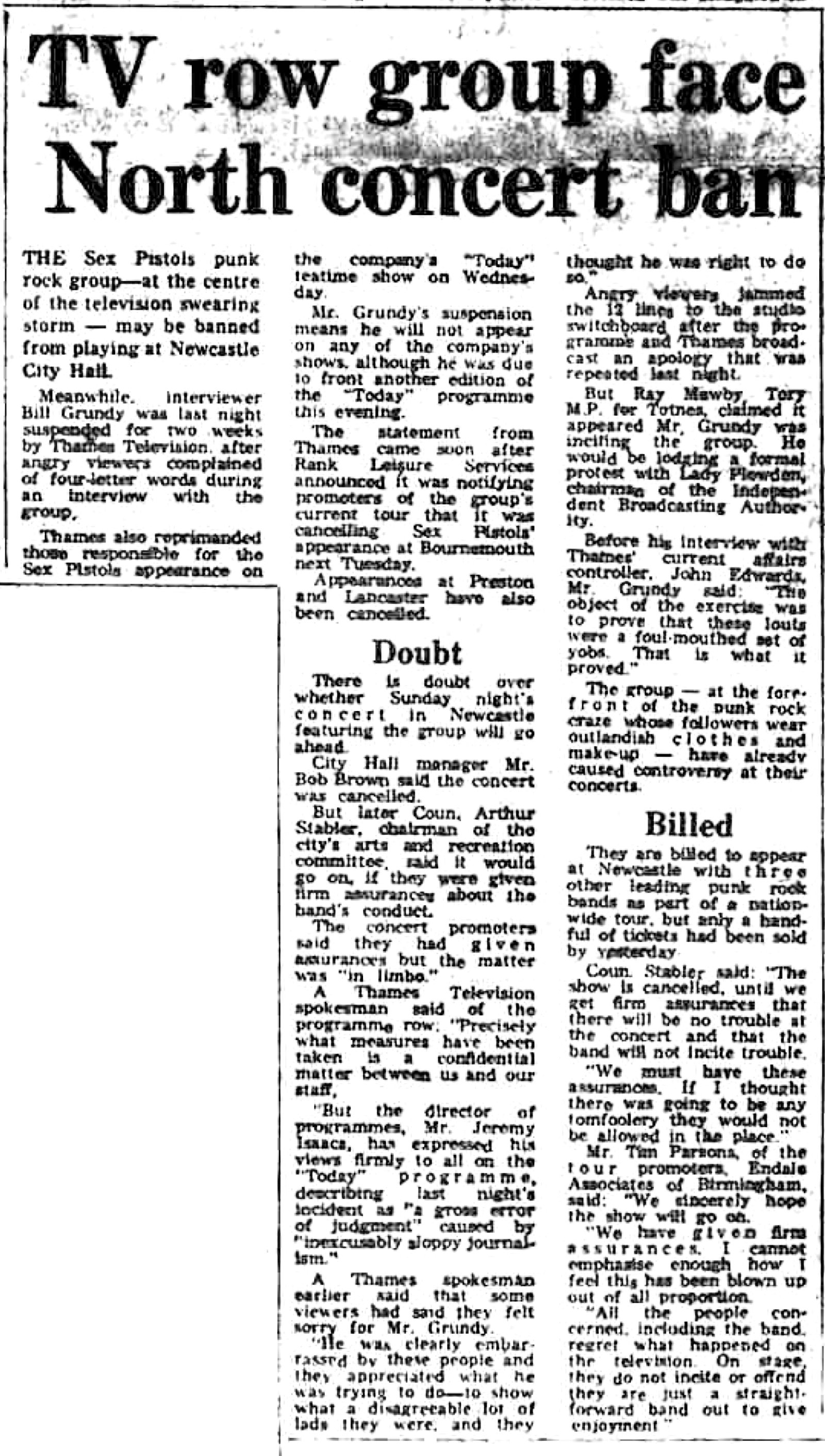 Shows have also been cancelled at Bournemouth, Preston, Lancaster, Norwich and Birmingham, and the future of one at Derby tonight is now uncertain. Sex Pistols hit the headlines after appearing on Thames Television'sToday teatime show on Wednesday. Angry viewers jammed the company's switchboard with complaints about four-letter words during an interview with the presenter of the show, Bill Grundy. Thames have publicly apologised for the incident. Mr. Grundy has since been suspended for two weeks and other staff have been reprimanded by Thames's director of programmes for "inexcusably sloppy journalism."