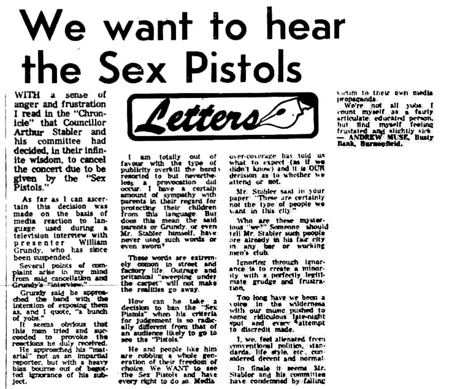 WITH a sense of anger and frustration I read in the Chronicle that Councillor Arthur Stabler and his committee had decided, in their infinite wisdom, to cancel the concert due to be given by the Sex Pistols.....