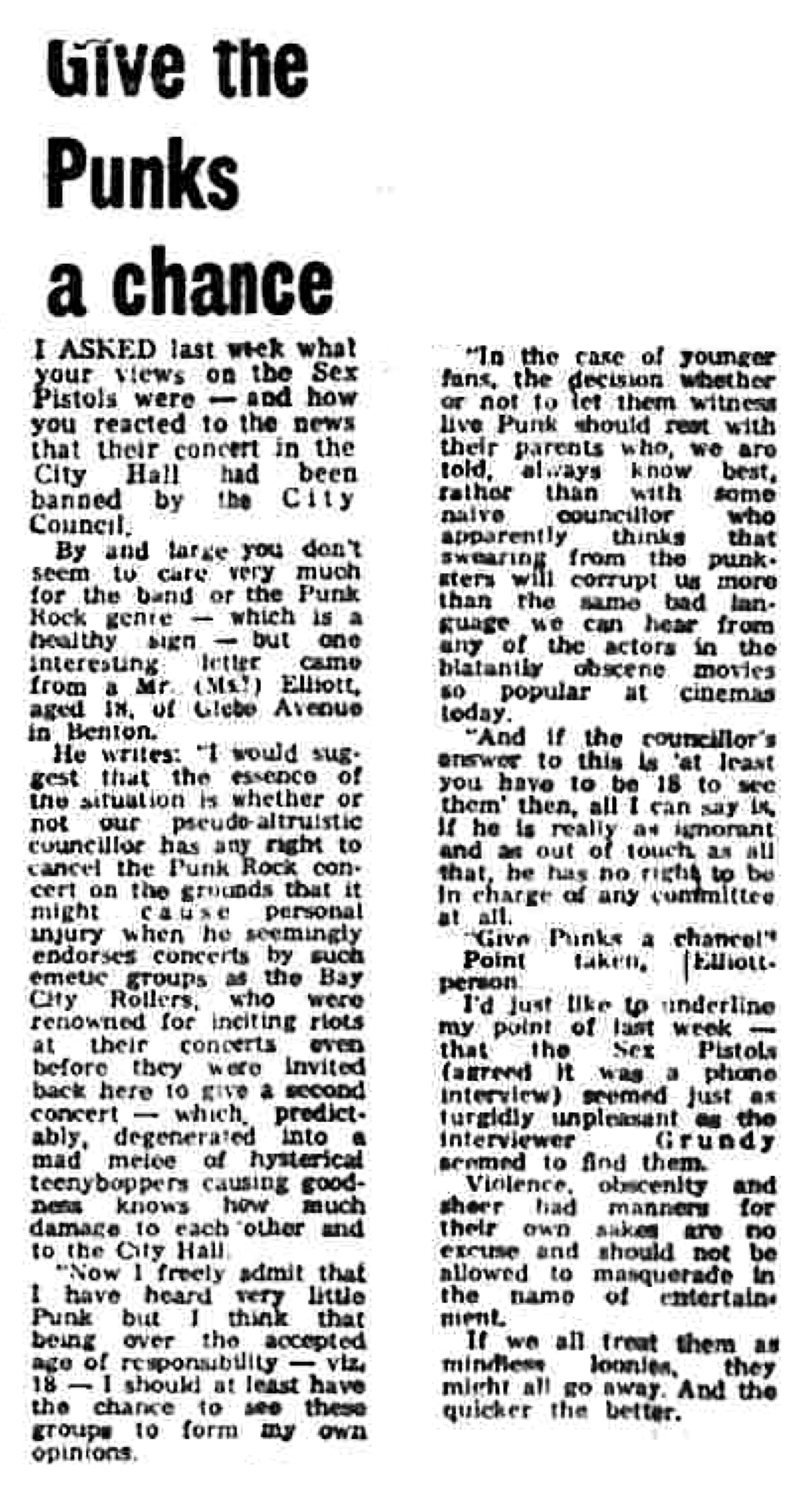 By and large you don’t seem to care very much for the band or the Punk Rock genre — which is a healthy sign — but one interesting letter came from a Mr. .... Elliott, aged 18, of Glebe Avenue in Benton.
