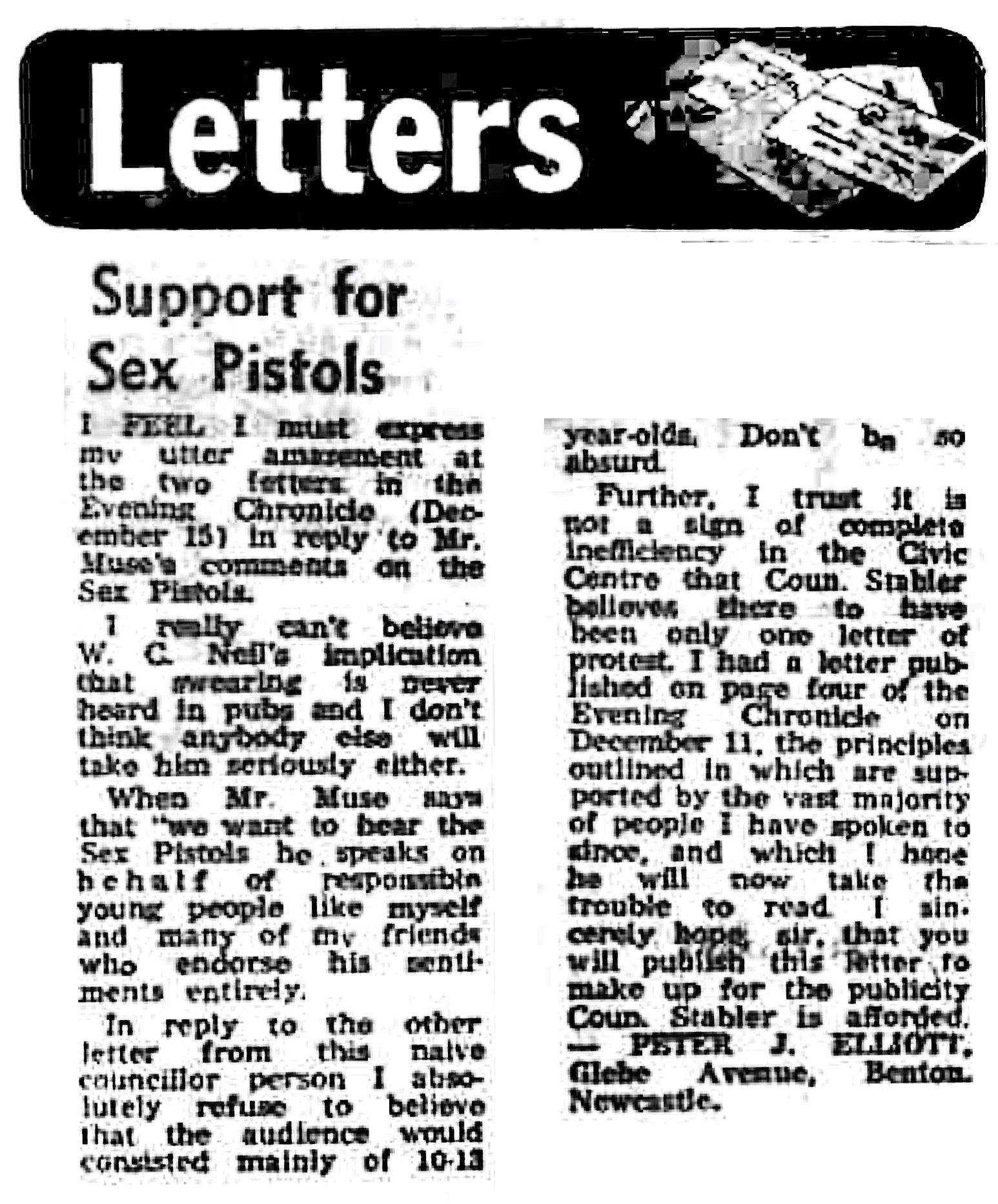 In reply to the letter from Mr. Andrew Musk in the Evening Chronicle, dated December 8, re Sex Pistols, the decision to ban this group was taken by experienced officials and myself. The action being not the bookings had been in the main made by youngsters in the 10–13 years age group. Had it been an adult audience maybe a different decision could have been taken.