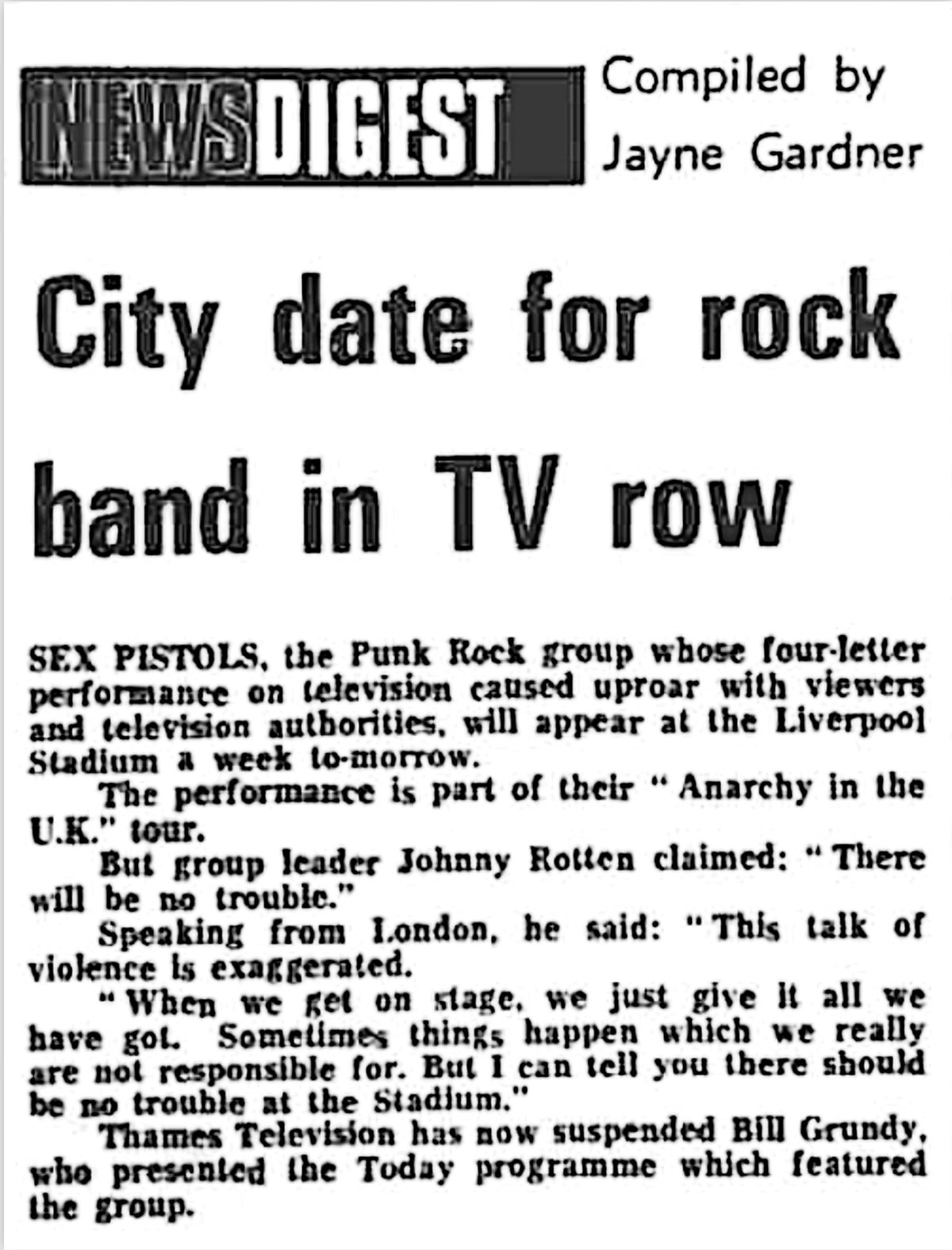 [extract]"The situation continued throughout December. The bands would travel to the next concert, only to find that it was canceled. A gig was scheduled to take place at Liverpool Stadium for December 11 and was hastily rearranged for the famous Cavern Club, where The Beatles started their career. The Liverpool Echo of December 7, 1976, re- ported under the headline "Call for boycott on Sex Pistols":