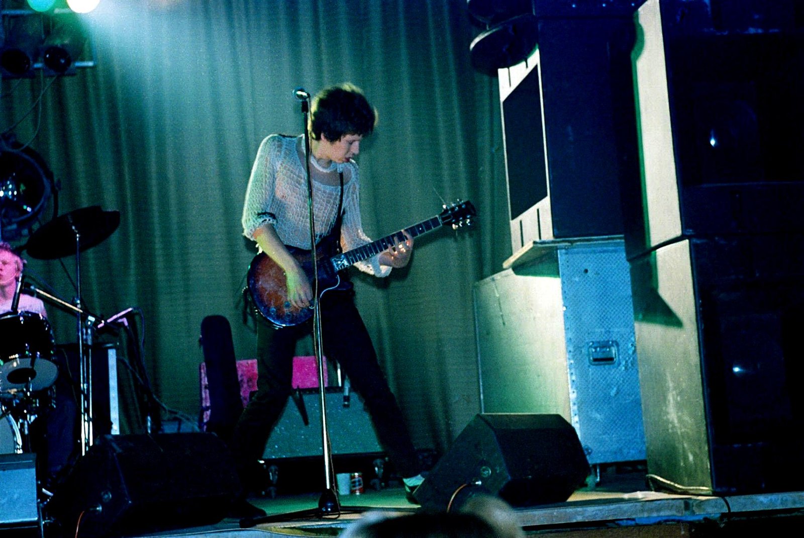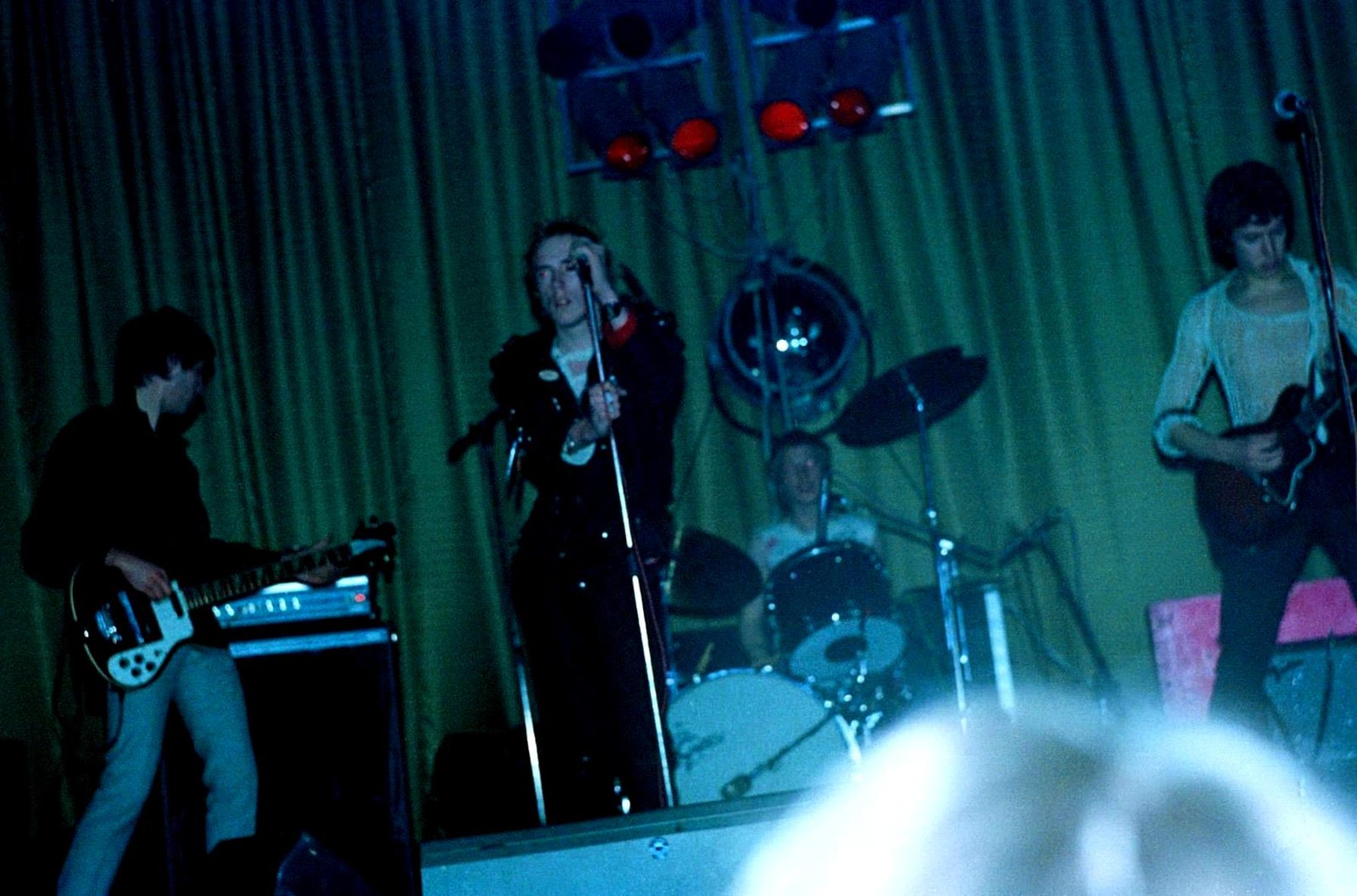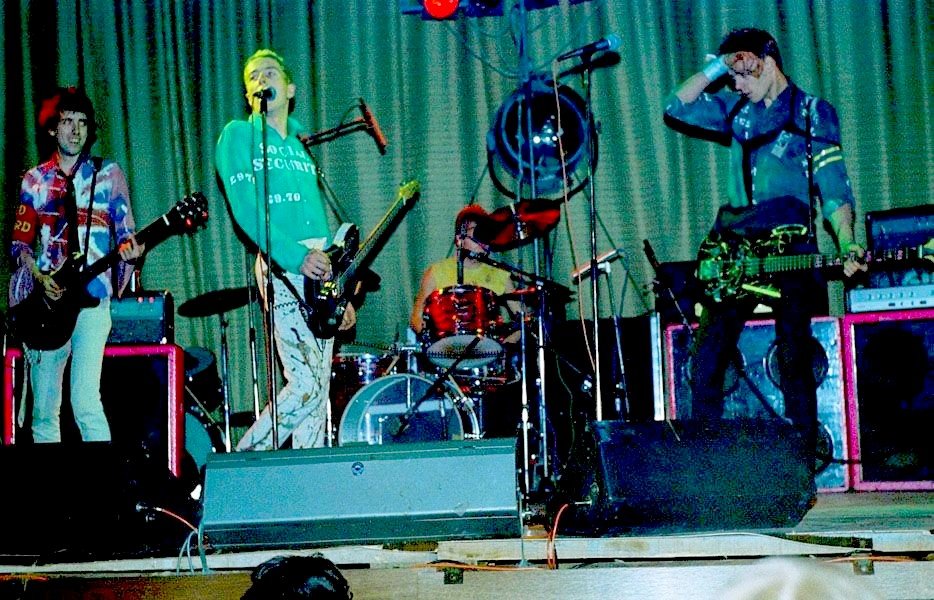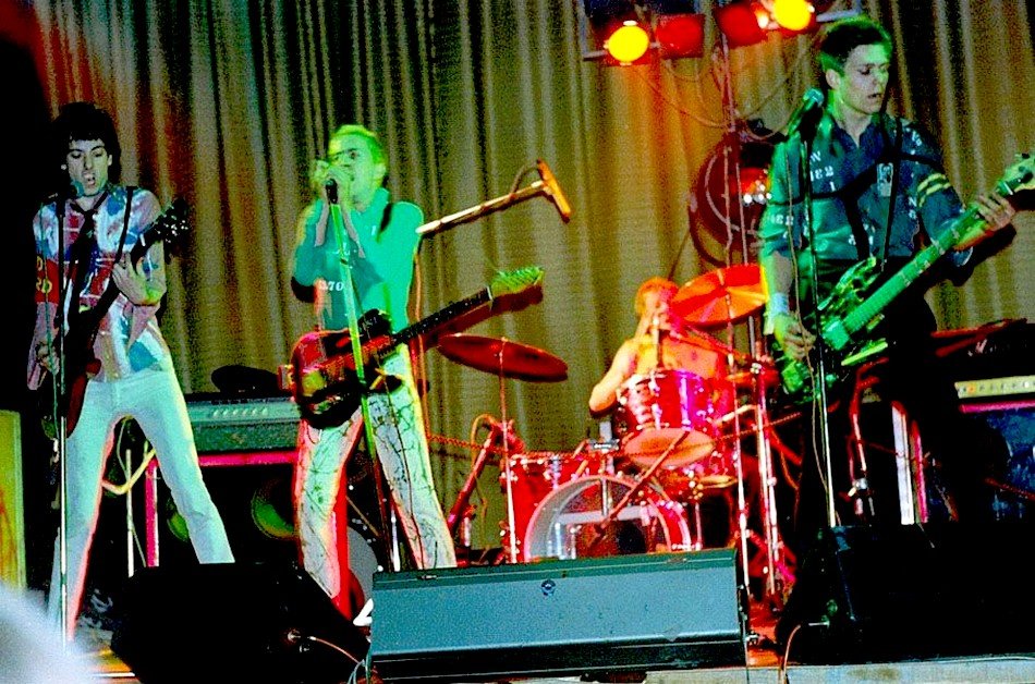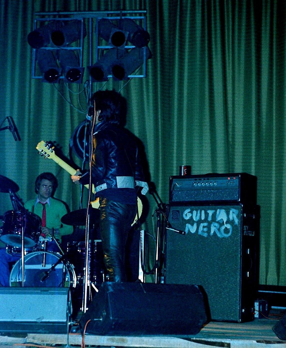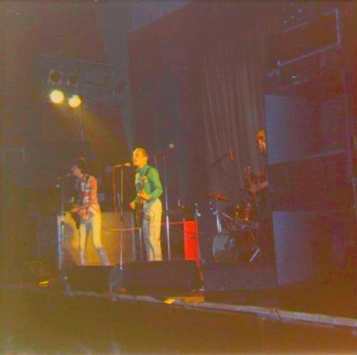 If Johnny was uncharacteristically quiescent, the others almost made up for it. Glen Matlock seemed to be playing his bass in a blur of knee jumps. Steve Jones practised calisthenics between savaging his guitar — he's beginning to justify the legend Guitar Hero sprayed on his amp. And Paul Cook kept right in there with his solid drumming and torn porno T-shirt.