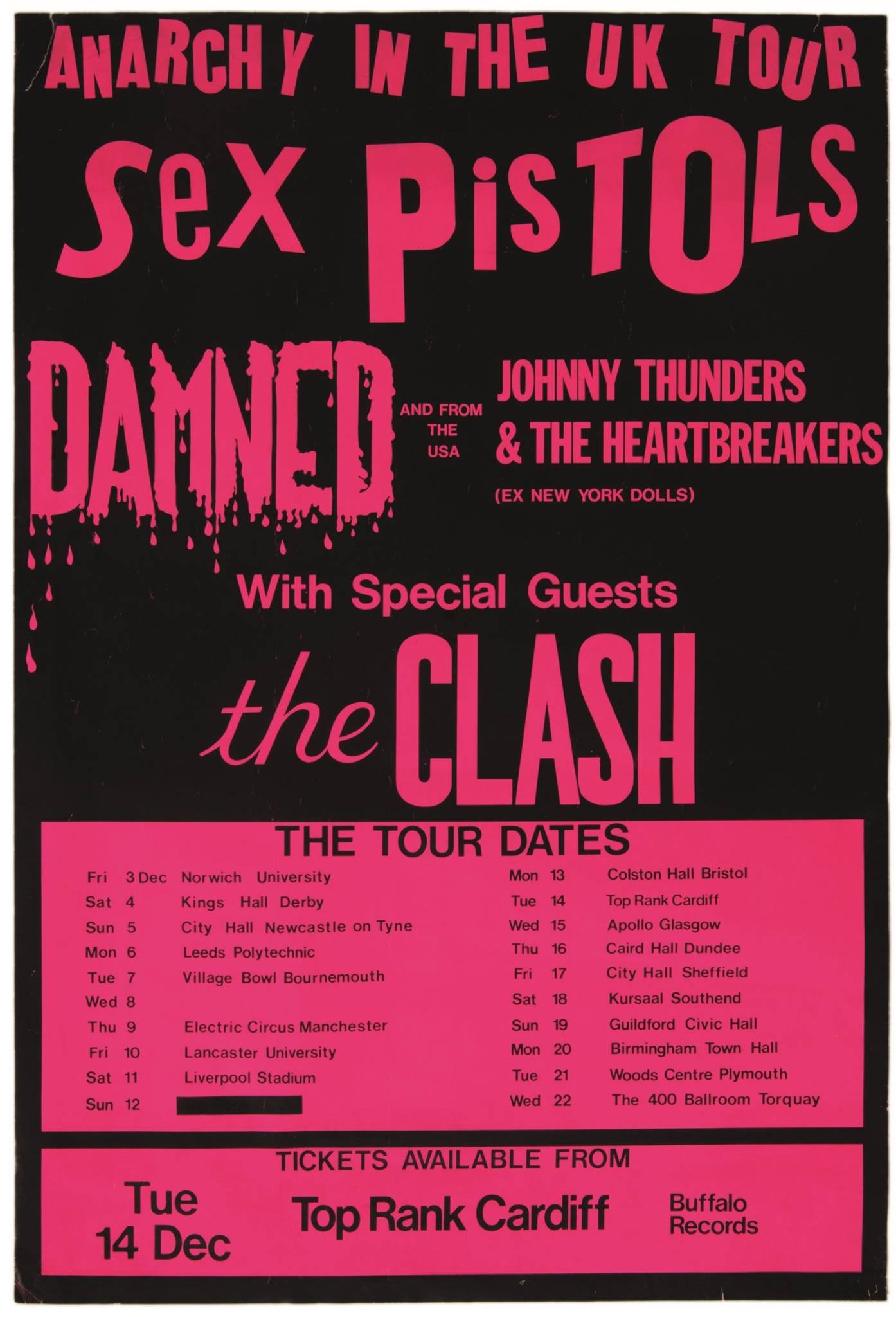 Tour dates have been rearranged and as Sounds goes to press they are: this week — Tuesday, Caerphilly Castle Cinema; Wednesday, Lafayette’s, Wolverhampton; Friday, Market Hall, Carlisle; Saturday, Electric Circus, Manchester. Next week: 20th, Bingley Hall, Birmingham; 21st Plymouth, Wood Centre; 22nd Penelope’s, Paignton; 23rd Plymouth, Wood Centre. For all the gigs, except Manchester where the Buzzcocks are again supporting, the bands playing are the Pistols, The Clash and the Heartbreakers.