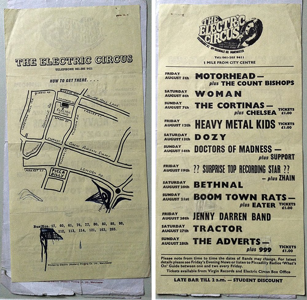 The Electric Circus was a music venue in Collyhurst, Manchester, England, situated at the corner of Teignmouth Street and Collyhurst Street. The building was originally the Palace Cinema, then the Top Hat Club run by Bernard Manning, and later a bingo hall. It became a heavy metal club in the 1970s until punk arrived there in 1976, and Richard Boon and Alan Robinson started promoting nights there. The venue was an iconic and seminal place for punk rock in 1970s Manchester, hosting a wide range of bands, including The Clash, The Damned, Buzzcocks, and The Fall .