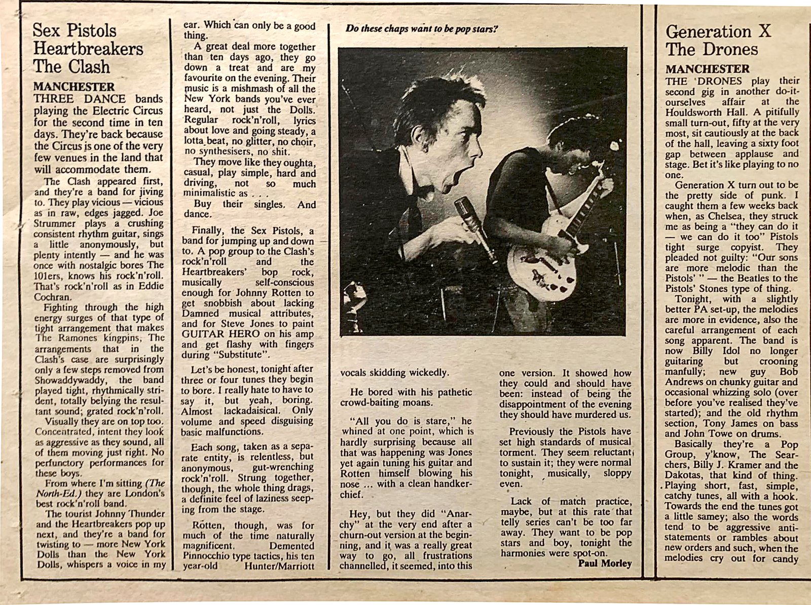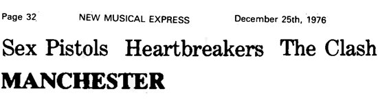 “To turn up to a Sex Pistols show nowadays is to make a statement to the world that you care about rock ’n’ roll and don’t give a Bill Grundy what the yellow-press thinks. And enough kids in Manchester, God bless ’em, were prepared to do just that, almost filling the place.” (Jonh Ingham, SOUNDS, 25 Dec 1976) .