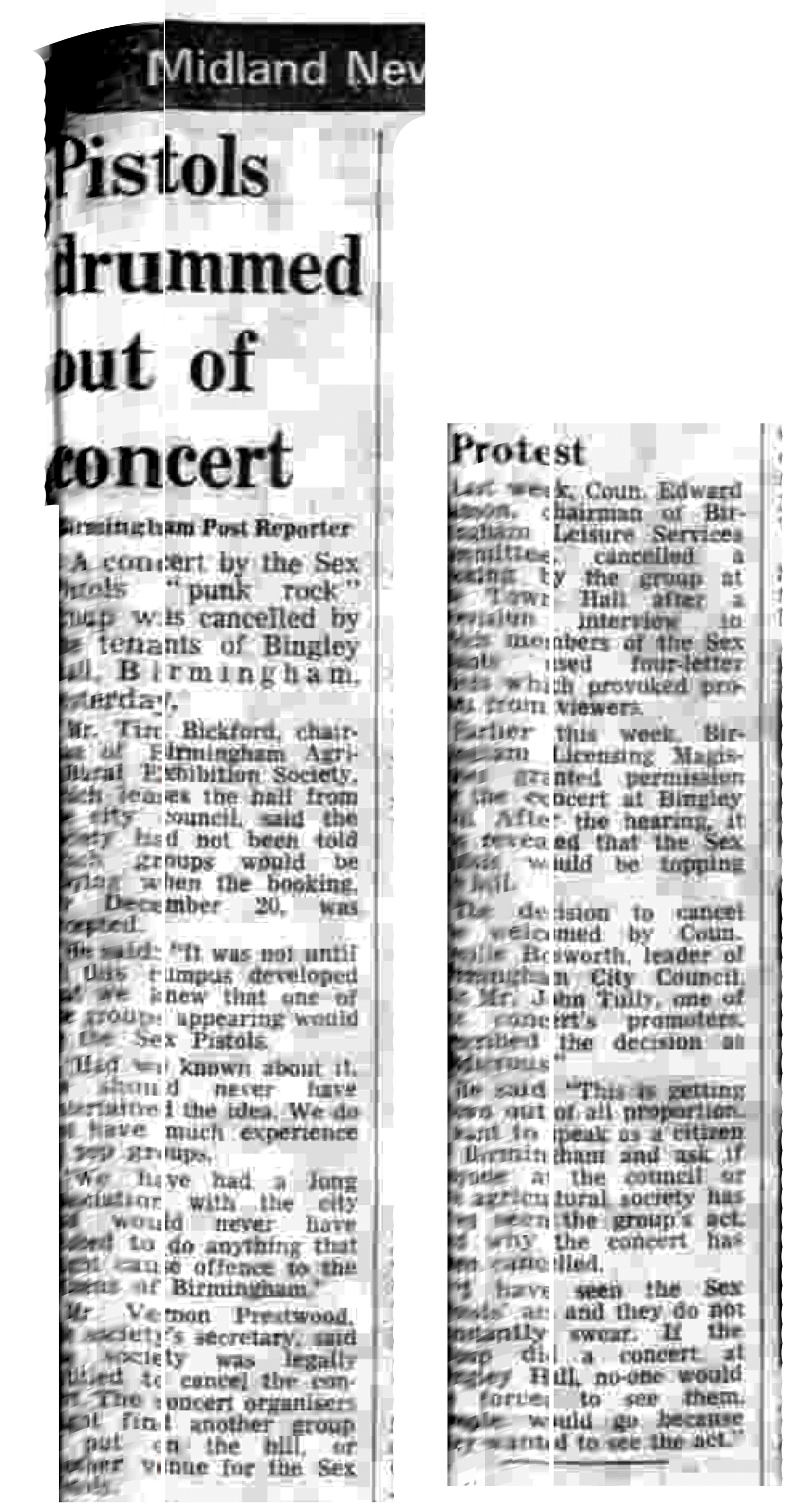 By 10 December, the Birmingham Daily Post carried the blunt headline “Pistols drummed out of concert.” Chairman Tim Bickford of the Agricultural Exhibition Society, which leased Bingley Hall, admitted, “It was not until all this rumpus developed that we knew that one of the groups appearing would be the Sex Pistols. Had we known about it, we should never have supported the idea. We don’t have much experience of pop groups. We have a long association with the city and would never have agreed to do anything that would cause offence to the people of Birmingham.”