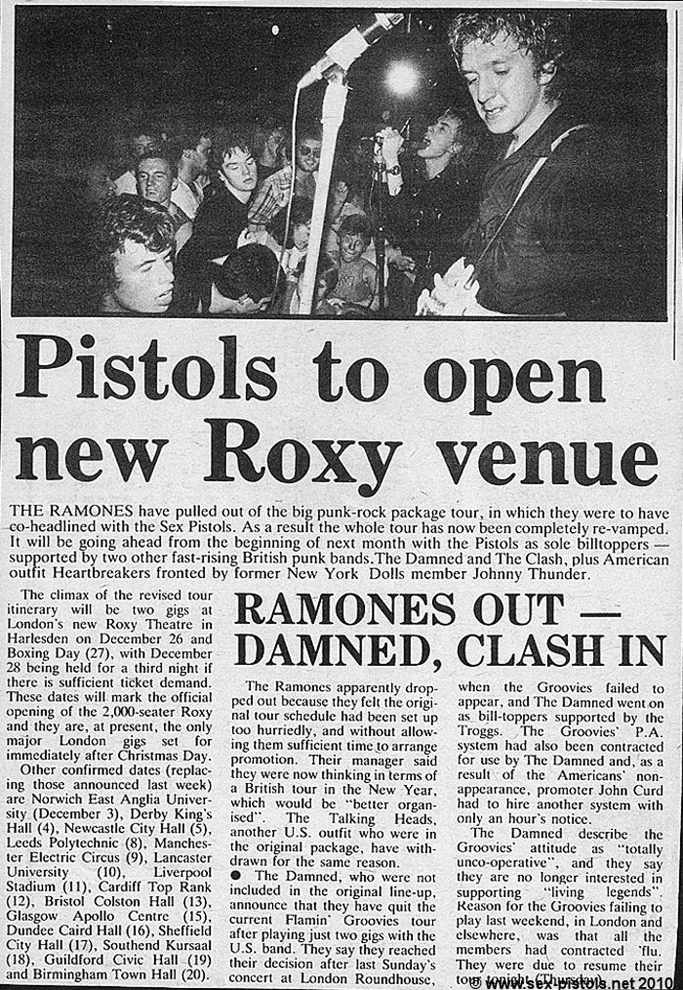 The Ramones have pulled out of the big punk-rock package tour, in which they were to have co-headlined with the Sex Pistols. As a result the whole tour has now been completely revamped. It will be going ahead from the beginning of next month with the Pistols as sole bill-toppers – supported by two other fast-rising British punk bands, The Damned and The Clash, plus American outfit The Heartbreakers fronted by former New York Dolls member Johnny Thunders.