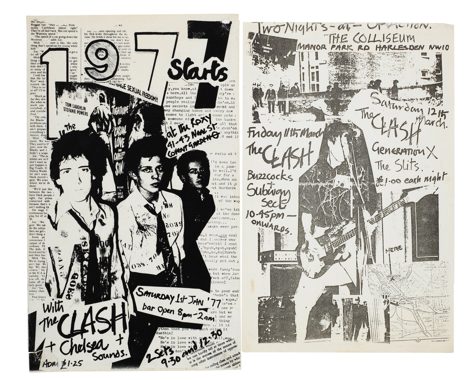 The Roxy Club was officially opened with a performance by the Clash on 1 January 1977. It quickly became established as the leading punk venue but closed after less than four months. These flyers show something of the range of bands that played at the club and are typical of the low-budget, DIY style of punk flyers and fanzines at the time.