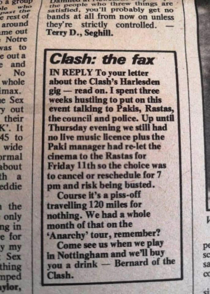 IN REPLY To your letter about the Clash's Harlesden gig-read on. I spent three weeks hustling to put on this event talking to Pakis, Rastas, the council and police. Up until Thursday evening we still had no live music licence plus the Paki manager had re-let the cinema to the Rastas for Friday 11th so the choice was to cancel or reschedule for 7 pm and risk being busted.