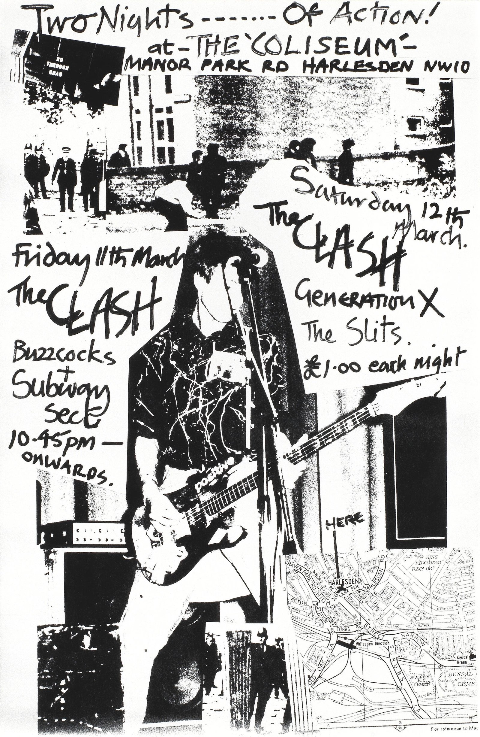 Bernard Rhodes: "It was important to find venues with an aspect of danger, enhancing the Clash point of view. An early example of Clash cut and paste agit-prop Clash street-style artwork from March 1977, promoting a fantastic array of creative talent at a rousing all-night happening."