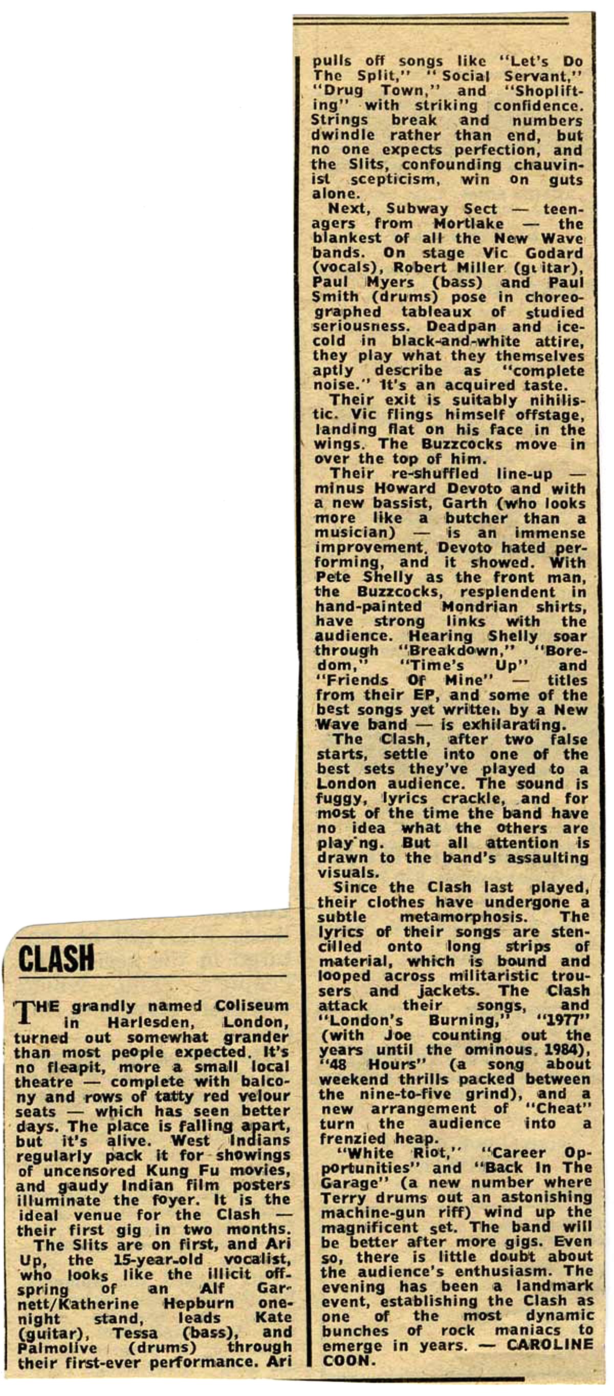— Focus on the Harlesden Colosseum gig (March 1977): The Slits debut, Subway Sect revival, new-look Buzzcocks, capped by a ferocious Clash set.