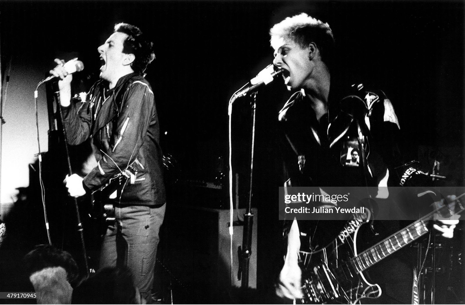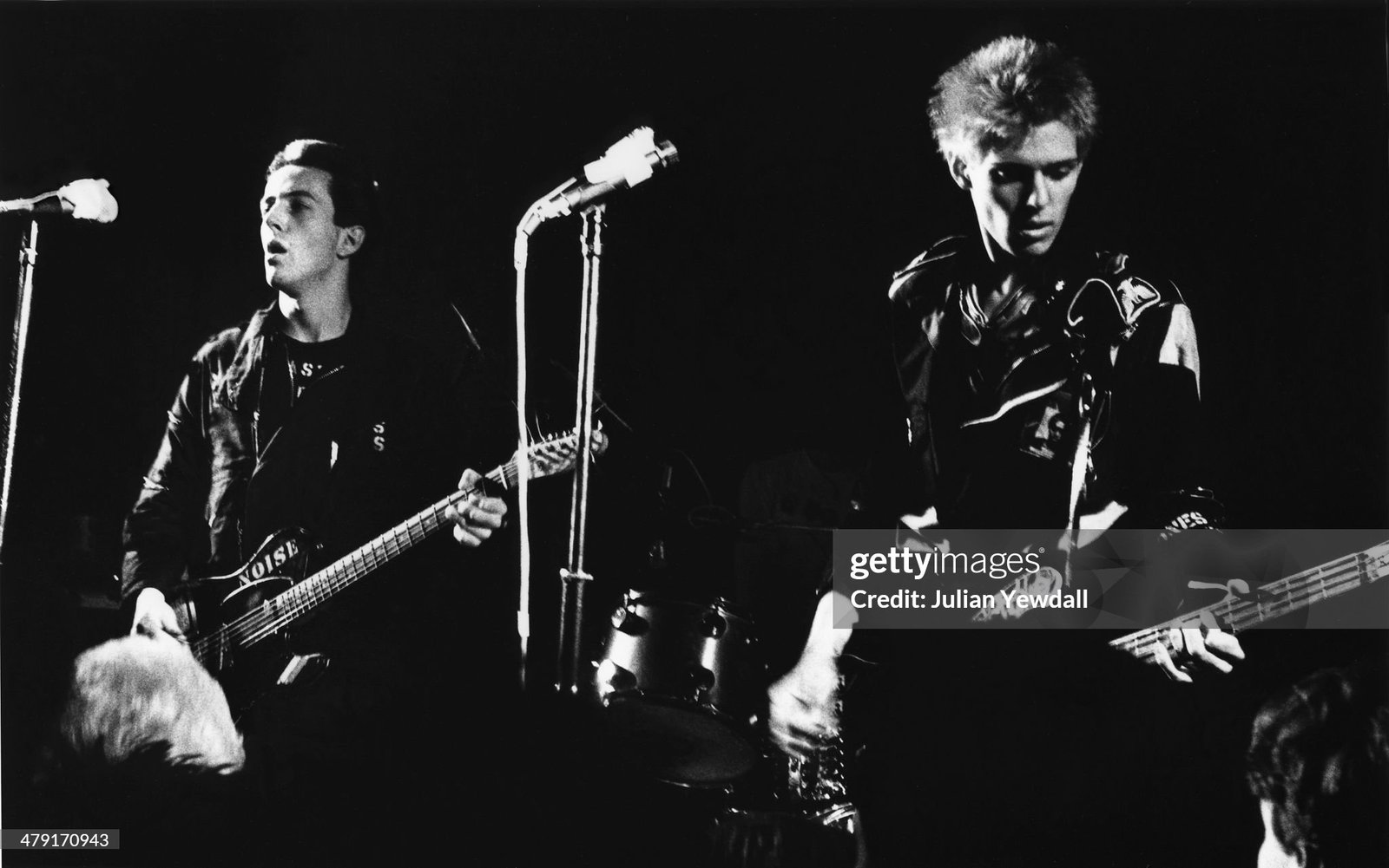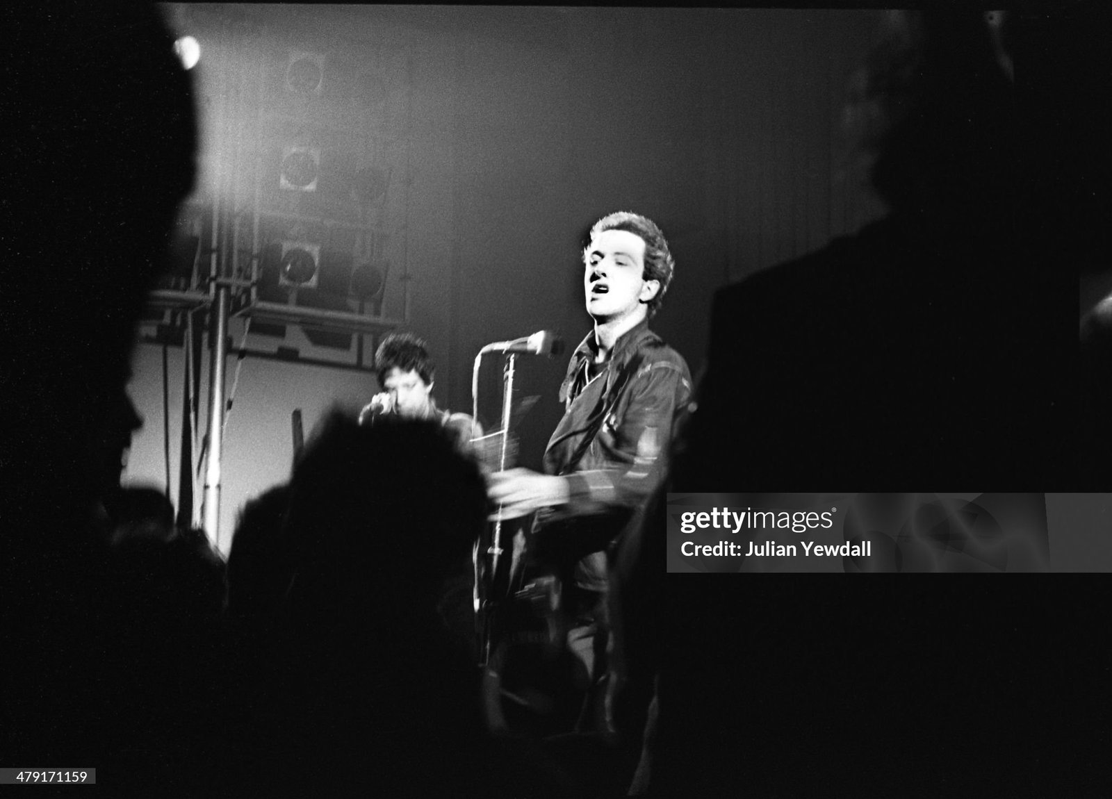 Joe Strummer, Mick Hones and Paul Simonon of The Clash performing live onstage as young with Shane MacGowan pictured in audience (Photo by Ian Dickson Redferns)