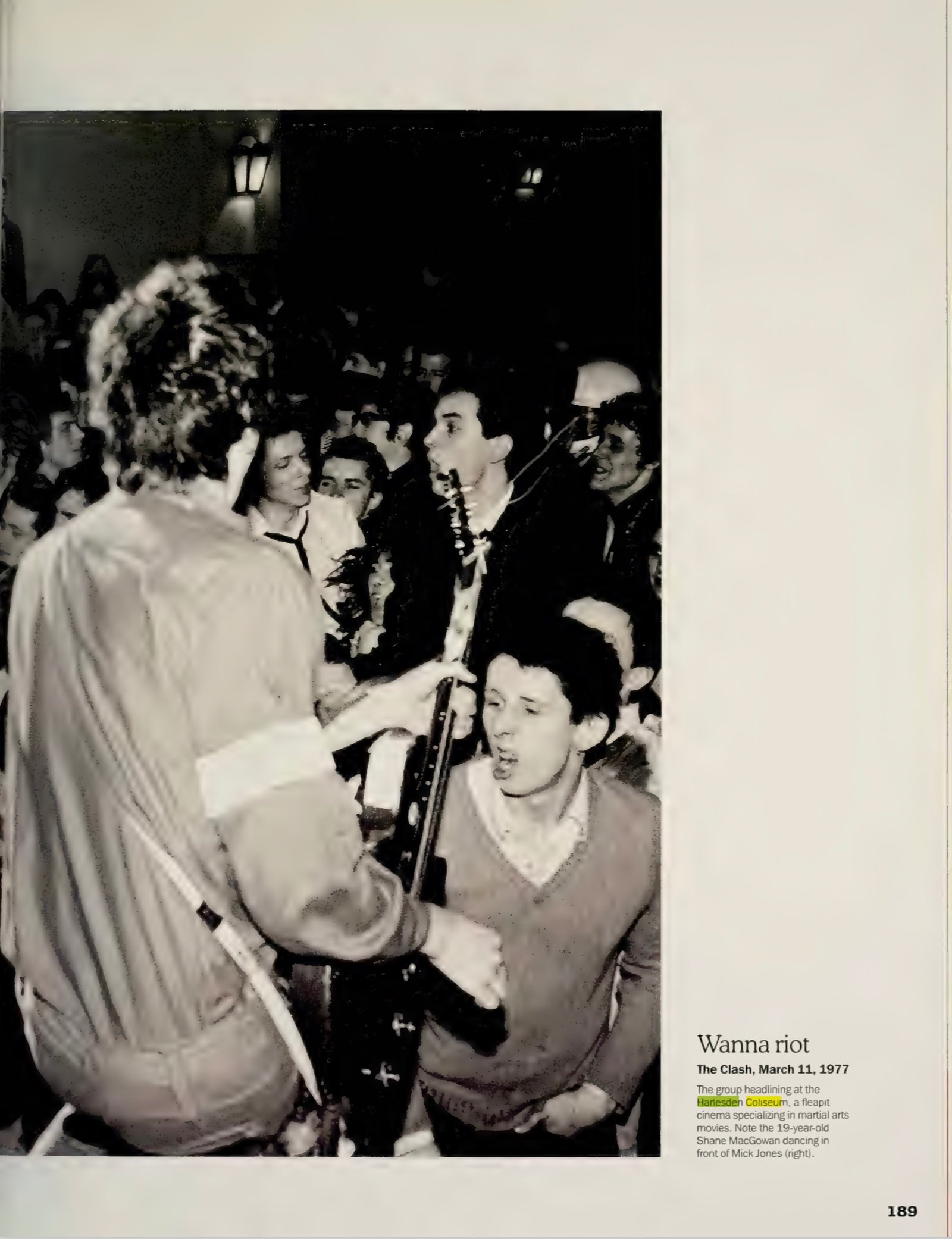 Wanna Riot The Clash, March 11, 1977 The group headlining at the Harlesden Coliseum, afleapit cinema specializing Inmartial arts movies. Note the 19-year-old Shane MacGowan dancing In front of Mick Jones (nght) .