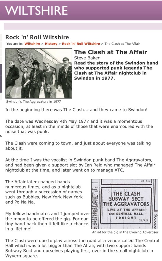 Formed in March 1977, The Aggravators were Swindon's first punk band. ... live performance at Swindon's ' THE AFFAIR ', a nightclub also managed by Ian Reid. ... moment came when we supported The Clash when they came to Swindon. ... Read memoirs from when the band supported the Clash on the 'White Riot Tour' ...