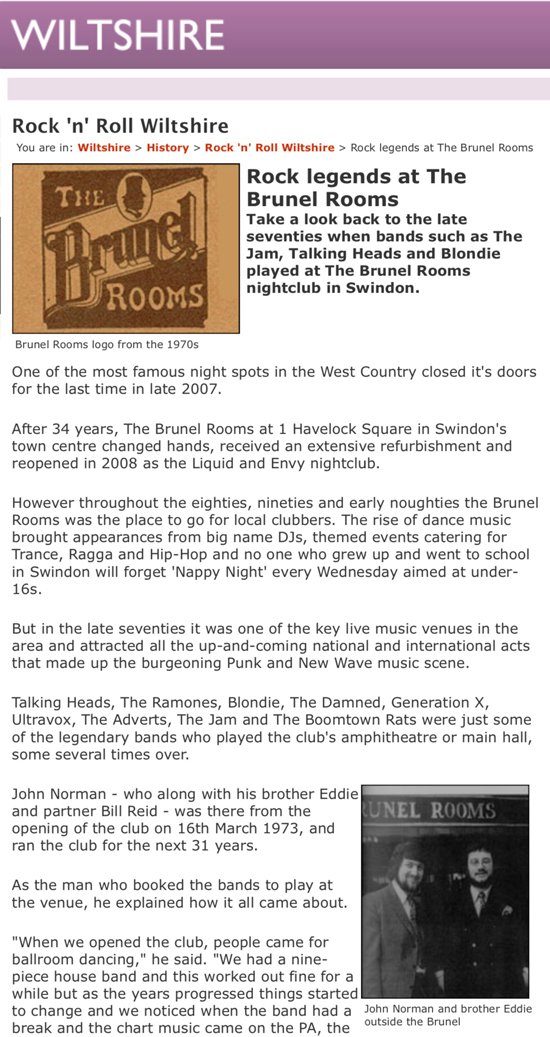 30 Jan 2009 - Take a look back to the late seventies when bands such as The Jam, Talking Heads and Blondie played at The Brunel Rooms nightclub in Swindon. ... acts that made up the burgeoning Punk and New Wave music scene. ... The band made their debut at the Brunel on Friday 30th June 1977, and the ...