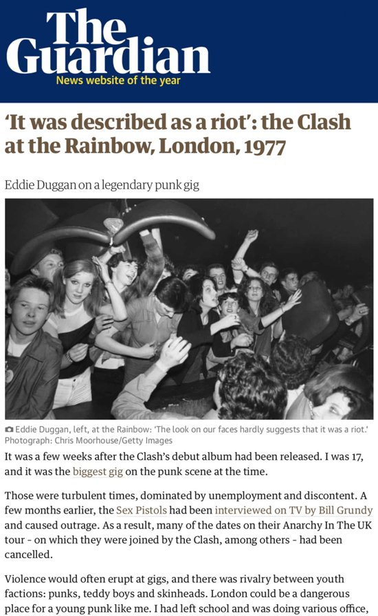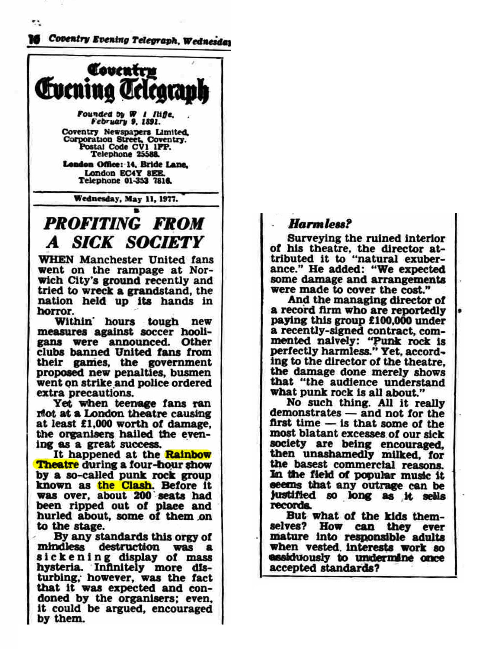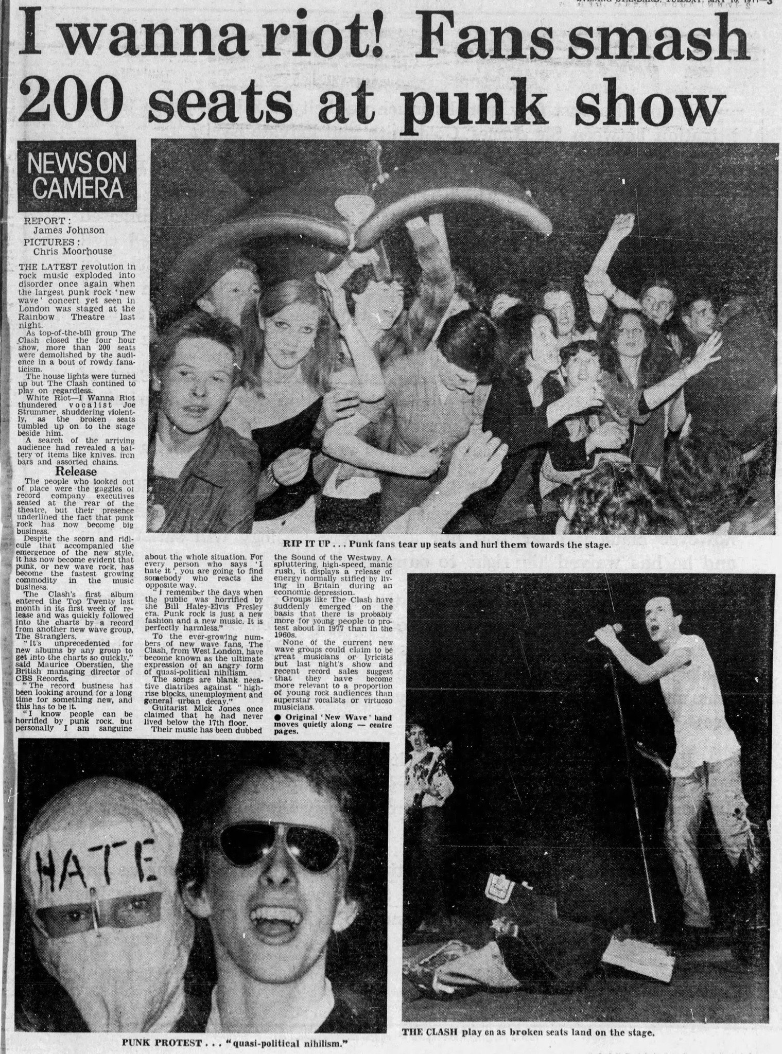 The Clash's concert at the Rainbow Theatre on May 9, 1977, was described as a riot in the press, but the response after the event was mixed. Some observers saw it as a reflection of the turbulent times and the punk movement's response to social discontent.