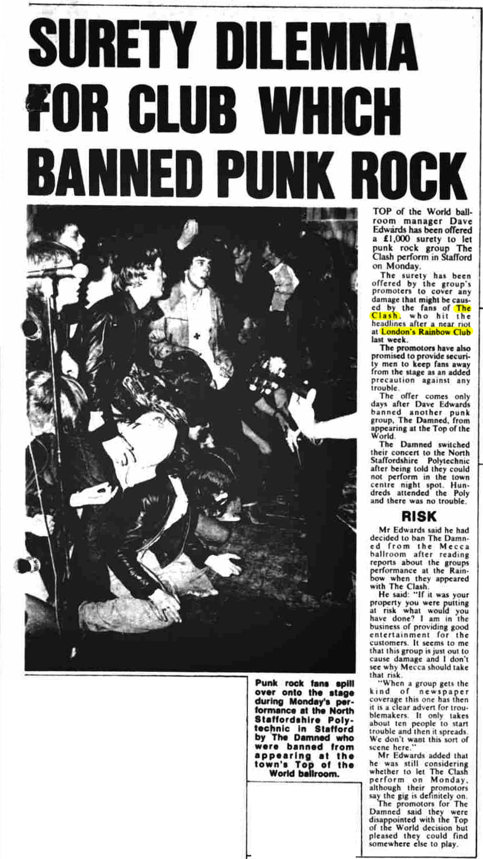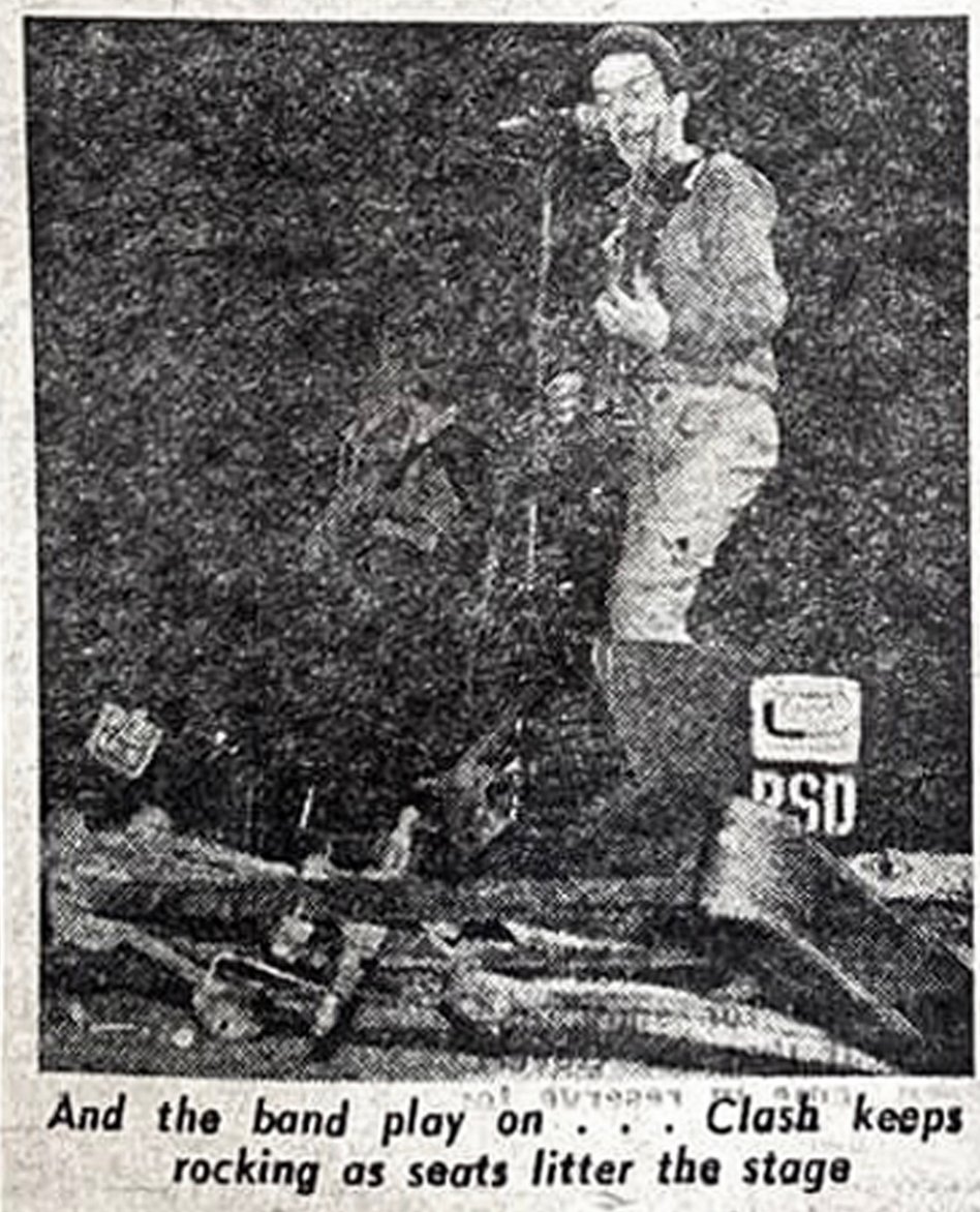 As long as the resultant debris was stacked neatly along the front of the stage, The Clash themselves remained unperturbed, while in the wings the Rainbow management likewise looked on apparently unalarmed. After all, it had been previously agreed that any damage would be paid for in full by The Clash management.