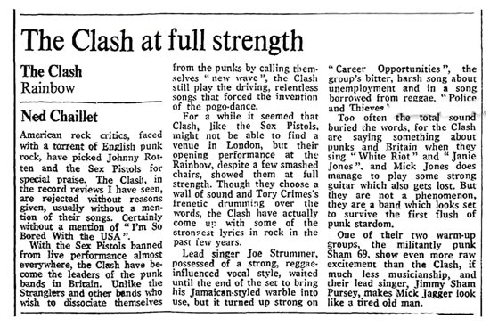 Reference: Spencer, N. (1977, May 21). Is This What We Ordered? / Clash Trash Backlash. New Musical Express, pp. 7-8.