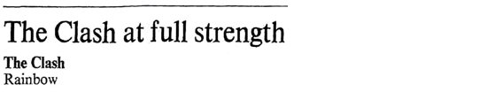CLASH: London Rainbow. Mon- day, May 9. Starts 7.30pm. Support: Subway Sect. Tickets £2.20.