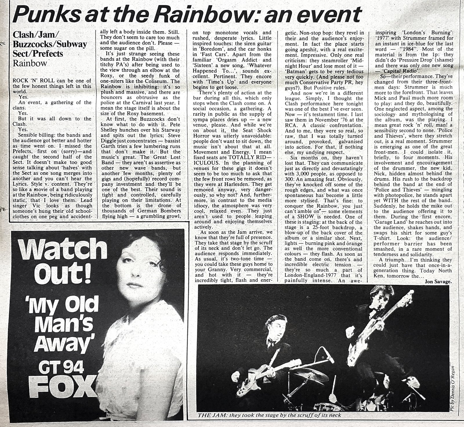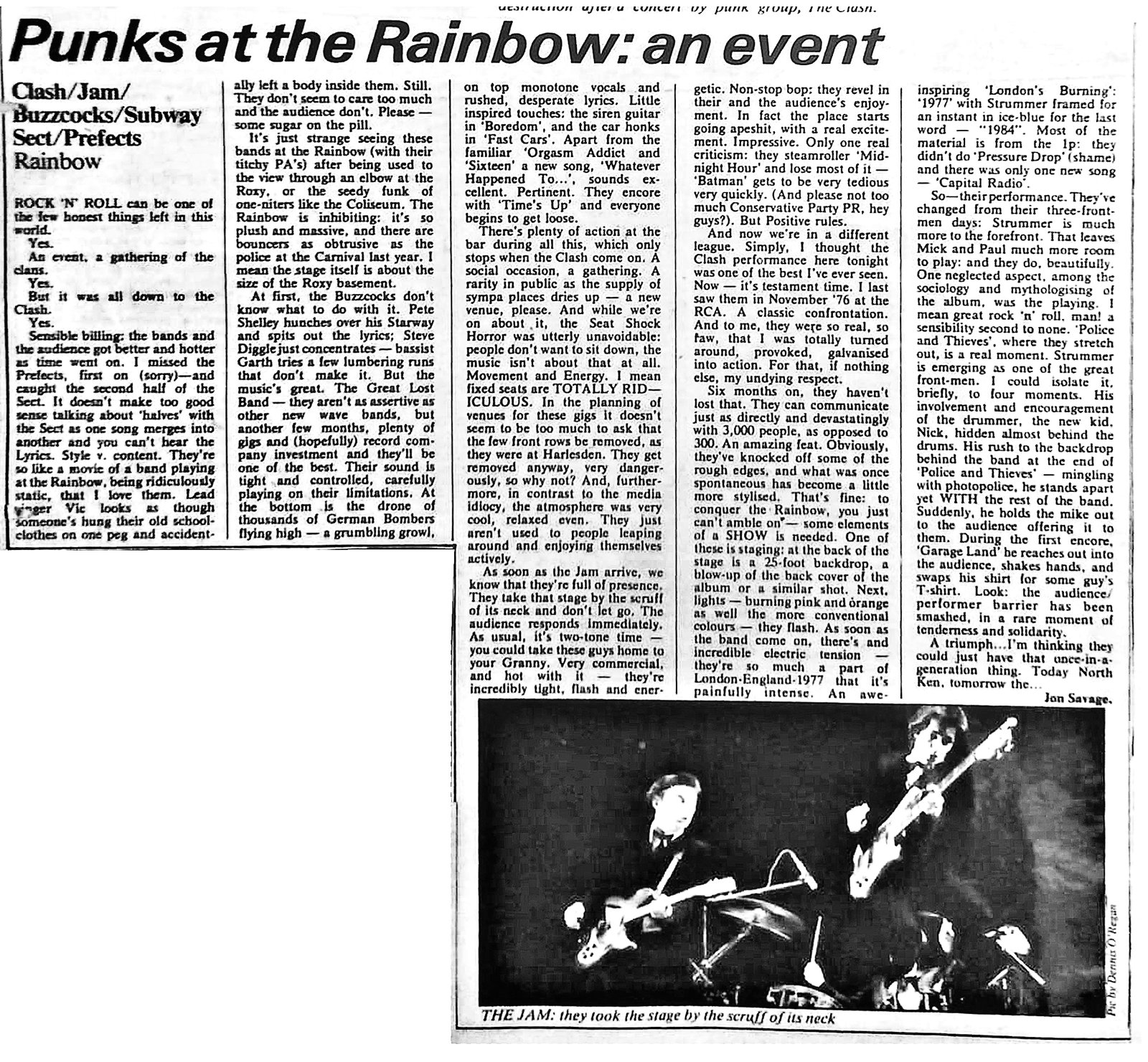 Andy Fair - Saw The Clash at The Rainbow May 77. the buzzcocks .subway sect the jam the prefects. .all in support. .the clash rocked N4 that night .seats ripped out .after white riot