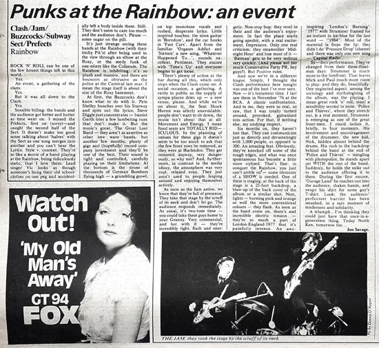 The famous riot gig in which 200 seats were ripped out. Ecstatic fans could not sit down and as the Jam finished their set the mayhem began. The Clash opened with Londons Burning and fighting broke out.