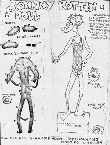 JOHNNY ROTTEN DOLL . INSTRUCTIONS: CUT OUT FOLD TABS OVER AND STAND BACK AND REVEL IN ALL MY CREATIVITY. ALSO COLOUR THEM IN AS COLOURS SUGGESTED . SHOES , BERET , SHADES , BLACK 'BONDAGE' SUIT , WRISTBAND , DIGITAL WATCH . MORE NEXT ISSUE! FOLD BACK MB '77 . ALL CLOTHES AVAILABLE FROM... SEDITIONARIES , KINGS RD - CHELSEA .