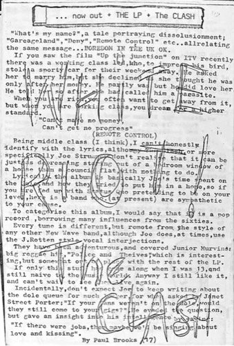 When you are rich, you often want to get away from it, but when you are working class, you dream of a higher standard. "Can't make no money, Can't get no progress" ( REMOTE CONTROL ). Being middle class (I think), I can't honestly identify with the lyrics, although The CLASH , or more specifically Joe Strummer don't realise that it can be just as depressing staring out of a bedroom window of a house than a council flat, with nothing to do .