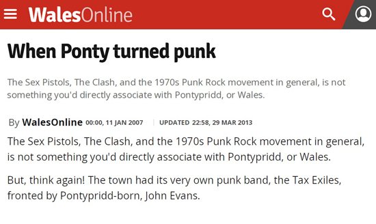 Indeed, John Evans, who now is a writer, and the rest of the band were held in such high esteem by their contemporaries, that in 1977, when The Clash came to play in Cardiff's Top Rank in Queen Street on their White Riot tour, Joe Strummer urged the audience to all get behind the Tax Exiles from the stage.