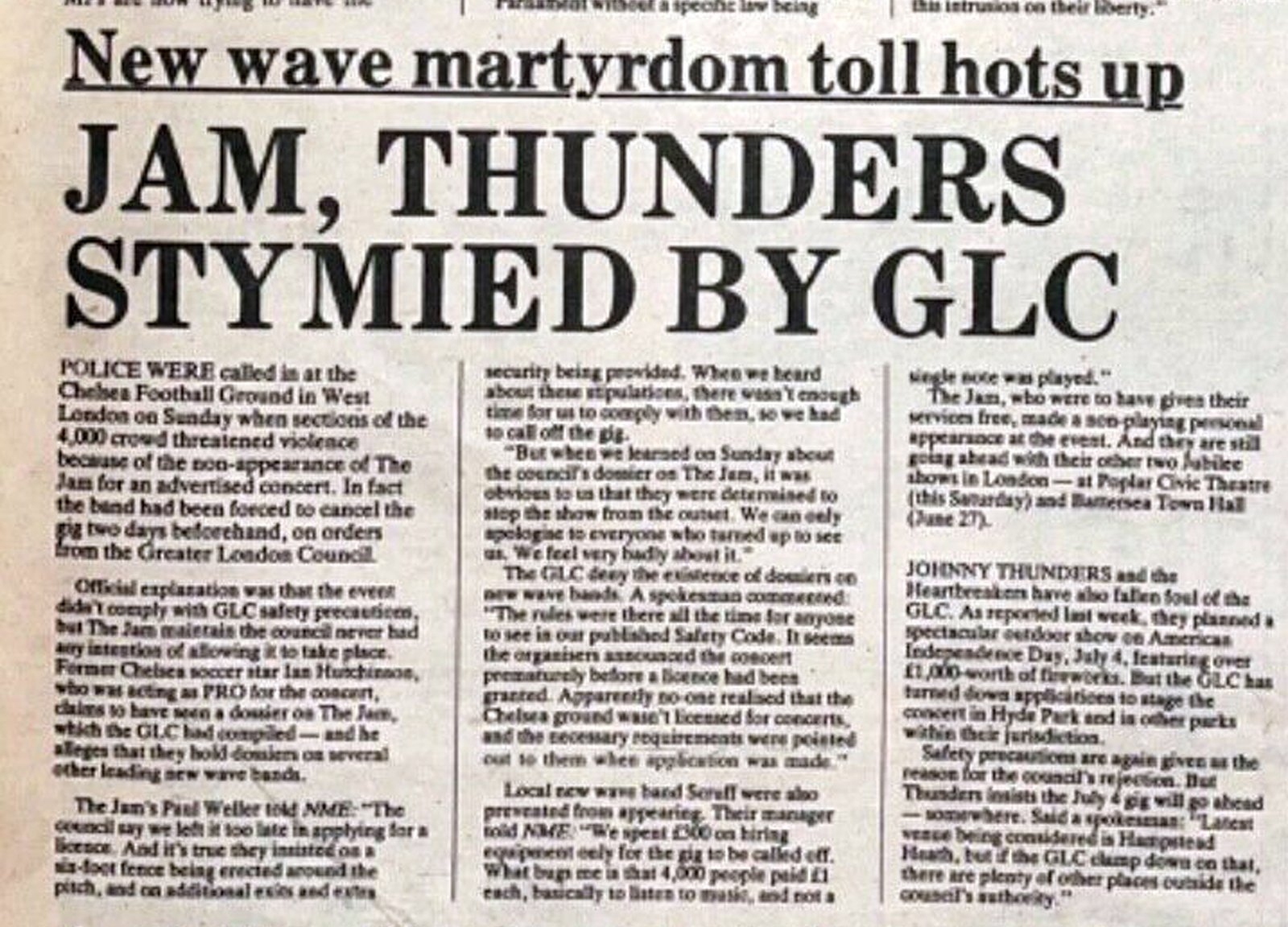 Photo: JAM : surprising victims of backlash/ STRANGLERS : councils ban dates/ CLASH : no insurance