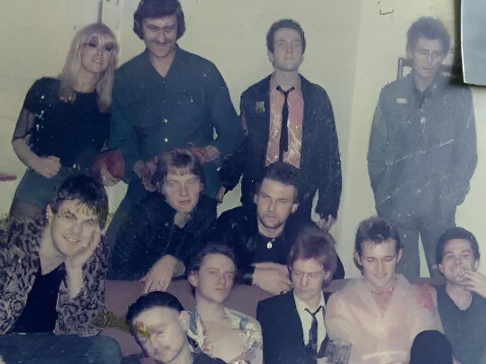 (A wide photograph shows The Damned performing live, with lead singer Dave Vanian in a white shirt in the foreground).