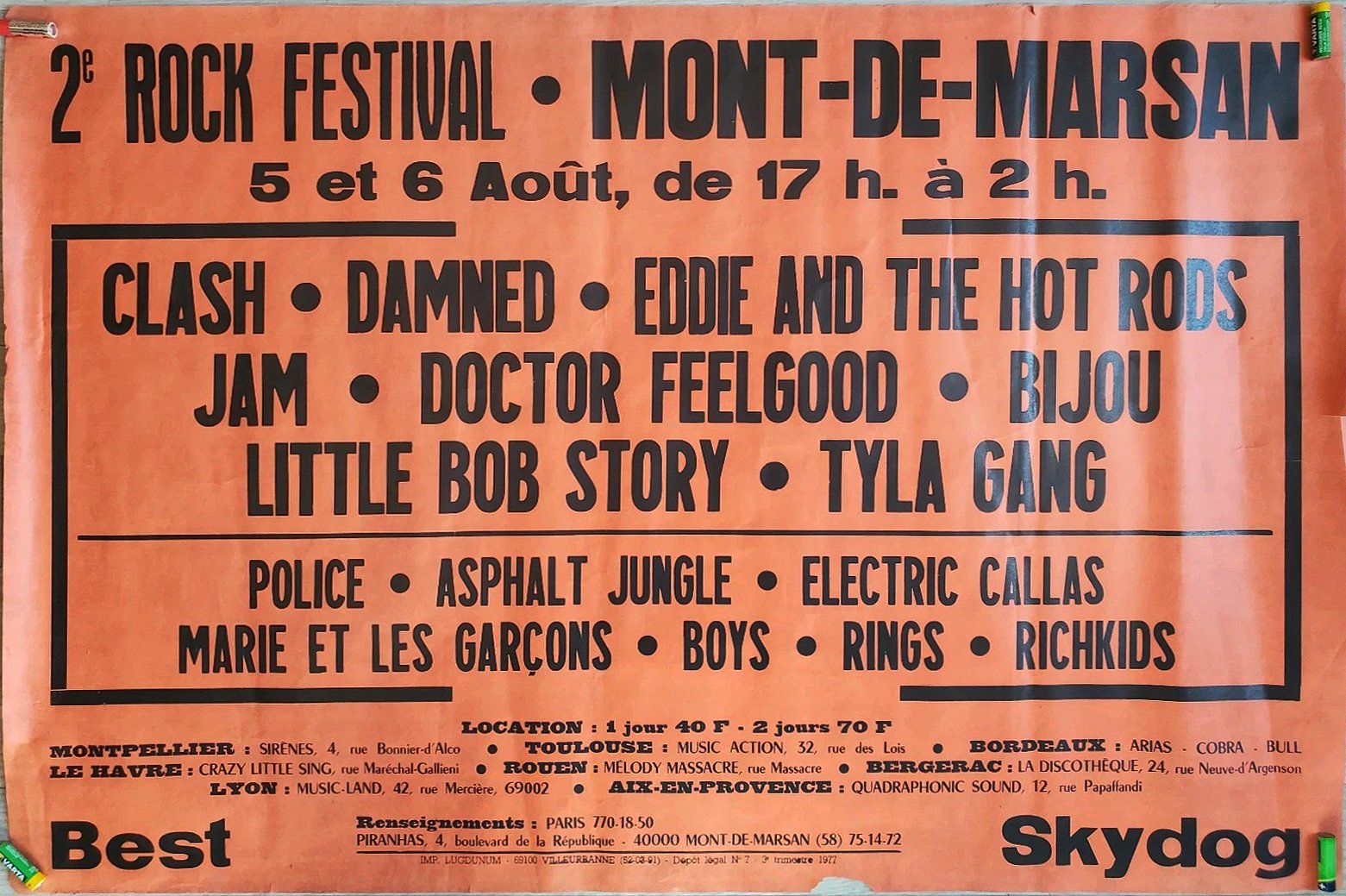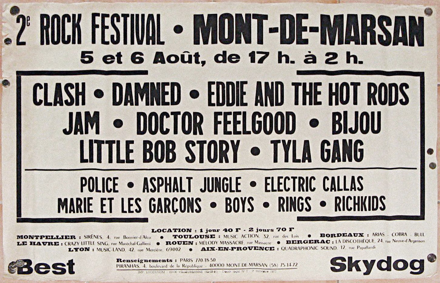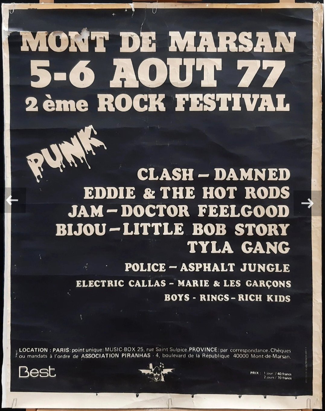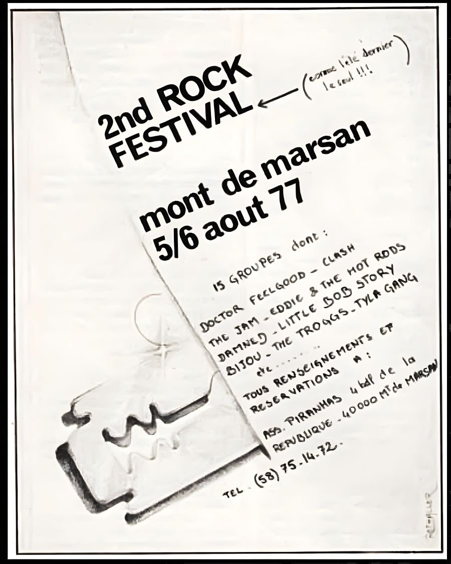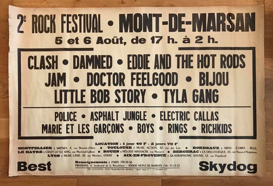 All the actors of the time nevertheless agree in saying that the leader of this adventure was indeed Marc Zermati, formerly founder of the French rock label Skydog Records, who died in 2020. It was he, mainly supported by Andrй-Marc Dubos, Pierre Thiollay and Larry Debay, who transformed this trial run into a major event, later managing to bring together European heavyweights such as The Clash, The Police, Dr. Feelgood, and many others, on 5 and 6 August 1977.