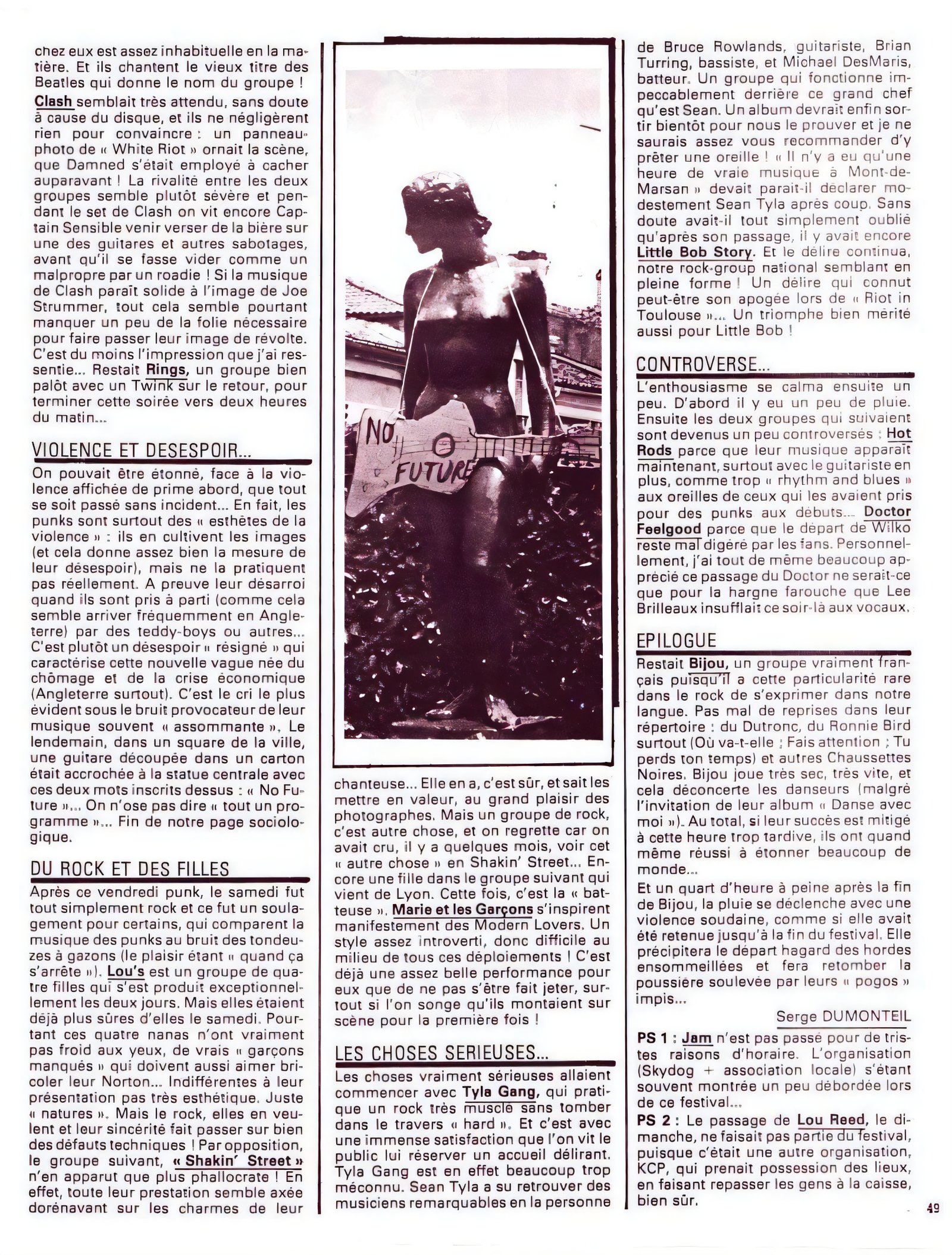Three thousand people churned up the earth of the arenas, attending performances of very uneven quality. The spectators, seated in the stands, threw their beers at those in the pit, without committing too many excesses nonetheless, behaving themselves more than one might imagine. The festival-goers mainly created, for two days, a strange atmosphere within the Landais town. Holidaymakers in search of calm rubbed shoulders with agitated punks, of whose existence most of them had previously been unaware.