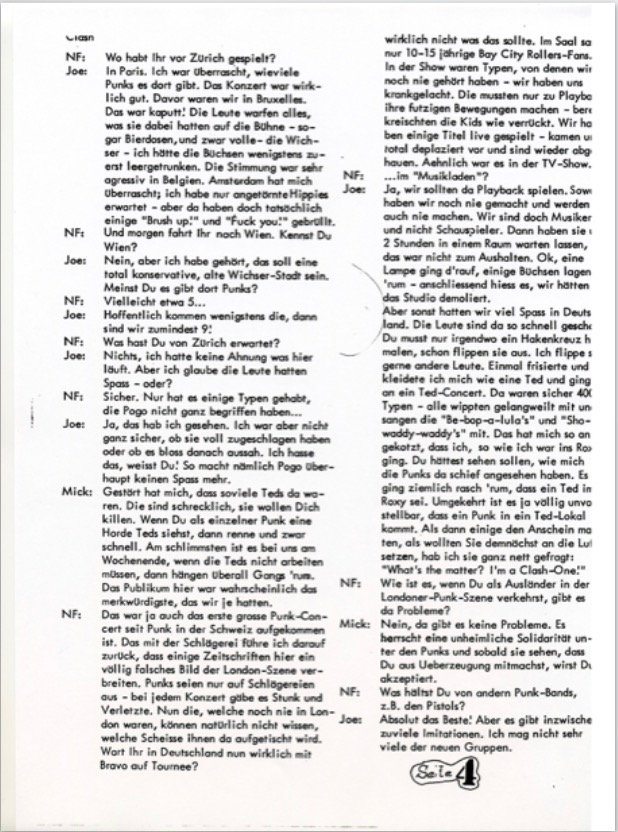 NF : Und morgen fahrt Ihr nach Wien . Kennst Du Wien ? Joe : Nein, aber ich habe gehört, das soll eine total konservative, alte Wichser-Stadt sein. Meinst Du es gibt dort Punks ? NF : Vielleicht etwa 5... Joe : Hoffentlich kommen wenigstens die, dann sind wir zumindest 9! NF : Was hast Du von Zürich erwartet? Joe : Nichts, ich hatte keine Ahnung was hier läuft. Aber ich glaube die Leute hatten Spass - oder? NF : Sicher. Nur hat es einige Typen gehabt, die Pogo nicht ganz begriffen haben... Joe : Ja, das hab ich gesehen. Ich war aber nicht ganz sicher, ob sie voll zugeschlagen haben oder ob es bloss danach aussah. Ich hasse das, weisst Du! So macht nämlich Pogo Uberhaupt keinen Spass mehr. Mick : Gestört hat mich, dass soviele Teds da waren. Die sind schrecklich, sie wollen Dich killen. Wenn Du als einzelner Punk eine Horde Teds siehst, dann renne und zwar schnell. Am schlimmsten ist es bei uns am Wochenende, wenn die Teds nicht arbeiten müssen, dann hängen Überall Gangs 'rum. Das Publikum hier war wahrscheinlich das merkwürdigste, das wir je hatten. NF : Das war ja auch das erste grosse Punk -Concert seit Punk in der Schweiz aufgekommen ist. Das mit der Schlägerei fuhre ich darauf zurück, dass einige Zeitschriften hier ein völlig falsches Bild der London -Szene verbreiten. Punks seien nur auf Schlägereien aus bei jedem Konzert gäbe es Stunk und Verletzte. Nun die, welche noch nie in London waren, können natürlich nicht wissen, welche Scheisse ihnen da aufgetischt wird. NF : Wart Ihr in Deutschland nun wirklich mit Bravo auf Tournee? Joe : wirklich nicht was das sollte. Im Saal sa nur 10-15 jährige Bay City Rollers -Fans. In der Show waren Typen, von denen wir noch nie gehört haben wir haben uns krankgelacht. Die mussten nur zu Playback ihre futzigen Bewegungen machen - bereits kreischten die Kids wie verrückt. Wir haben einige Titel live gespielt - kamen uns total deplaziert vor und sind wieder abgehauen. Aehnlich war es in der TV-Show. NF : ...im " Musikladen "? Joe : Ja, wir sollten da Playback spielen. Sows haben wir noch nie gemacht und werden wir auch nie machen. Wir sind doch Musiker und nicht Schauspieler. Dann haben sie uns 2 Stunden in einem Raum warten lassen, das war nicht zum Aushalten. Ok, eine Lampe ging d'rauf, einige Büchsen lagen 'rum anschliessend hiess es, wir hätten das Studio demoliert. Joe : Aber sonst hatten wir viel Spass in Deutschland . Die Leute sind da so schnell geschockt. Du musst nur irgendwo ein Hakenkreuz hinmalen, schon flippen sie aus. Ich flippe so gerne andere Leute. Einmal frisierte und kleidete ich mich wie eine Ted und ging an ein Ted -Concert. Da waren sicher 400 Typen alle wippten gelangweilt mit und sangen die " Be-bop-a-lula 's" und " Showaddy-waddy 's" mit. Das hat mich so angekotzt, dass ich, so wie ich war ins Roxy ging. Du hättest sehen sollen, wie mich die Punks da schief angesehen haben. Es ging ziemlich rasch 'rum, dass ein Ted in Roxy sei. Umgekehrt ist es ja völlig unvorstellbar, dass ein Punk in ein Ted -Lokal kommt. Als dann einige den Anschein machten, als wollten Sie demnächst an die Lulle setzen, hab ich sie ganz nett gefragt: "What's the matter? I'm a Clash -One!" NF : Wie ist es, wenn Du als Ausländer in der Londoner - Punk -Szene verkehrst, gibt es da Probleme? Mick : Nein, da gibt es keine Probleme. Es herrscht eine unheimliche Solidarität unter den Punks und sobald sie sehen, dass Du aus Ueberzeugung mitmachst, wirst Du akzeptiert. NF : Was hältst Du von andern Punk -Bands, z.B. den Pistols ? Joe : Absolut das Beste! Aber es gibt inzwischen zuviele Imitationen. Ich mag nicht sehr viele der neuen Gruppen. Seite 4
