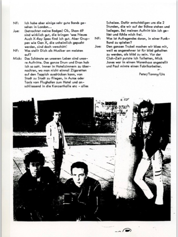 NF : Ich habe aber einige sehr gute Bands gesehen in London ... Joe : (betrachtet meine Badges) Ok, Sham 69 sind wirklich gut, die bringen 'was Neues. Auch X-Ray Spex find ich gut. Aber Gruppen wie Gen X , die unheimlich gepusht werden, sind doch verschütt! NF : Joe : NF : Was stellt Dich als Musiker am meisten auf? Mick : Das Schönste an unserem Leben sind unsere Auftritte. Das ganze Drum und Dran hab ich so satt. Immer in Hotelzimmern zu übernachten, wo man nicht einmal Zigaretten auf dem Teppich ausdrücken kann, von Stadt zu Stadt zu fliegen, in Autos oder Taxis vom Flughafen zum Hotel und anschliessend in die Konzerthalle etc alles Scheisse. Dafür entschädigen uns die 2 Stunden, die wir auf der Bühne stehen und loslegen. Bei meinem Auftritt bin ich gelöst und fuhle mich frei. NF : Was ist Aufregendes daran, in einer Punk -Band zu spielen? Joe : Den ganzen Trubel machen wir bloss mit, weil es angenehmer ist für blöd gehalten zu werden, als blöd zu sein. Vor der Clash -Zeit putzte ich Toiletten, Mick Jones war in einem Warenhaus angestellt und Paul mimte einen Fabrikarbeiter.