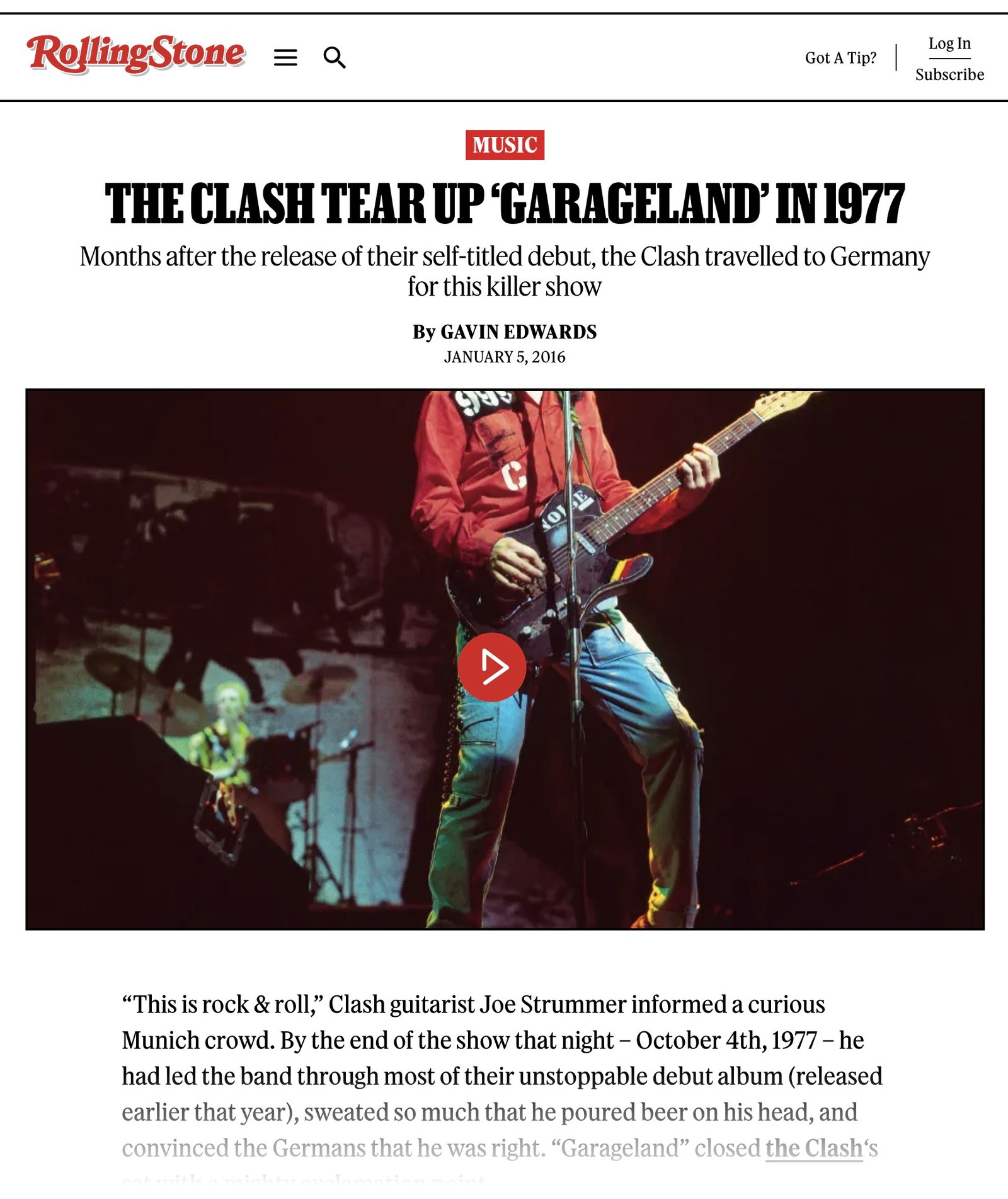 “This is rock & roll,”Clash guitarist Joe Strummer informed a curious Munich crowd. By the end of the show that night— October 4th, 1977 —he had led the band through most of their unstoppable debut album ( The Clash ), sweated so much that he poured beer on his head, and convinced the Germans that he was right. “ Garageland ” closed The Clash ’s set with a mighty exclamation point.
