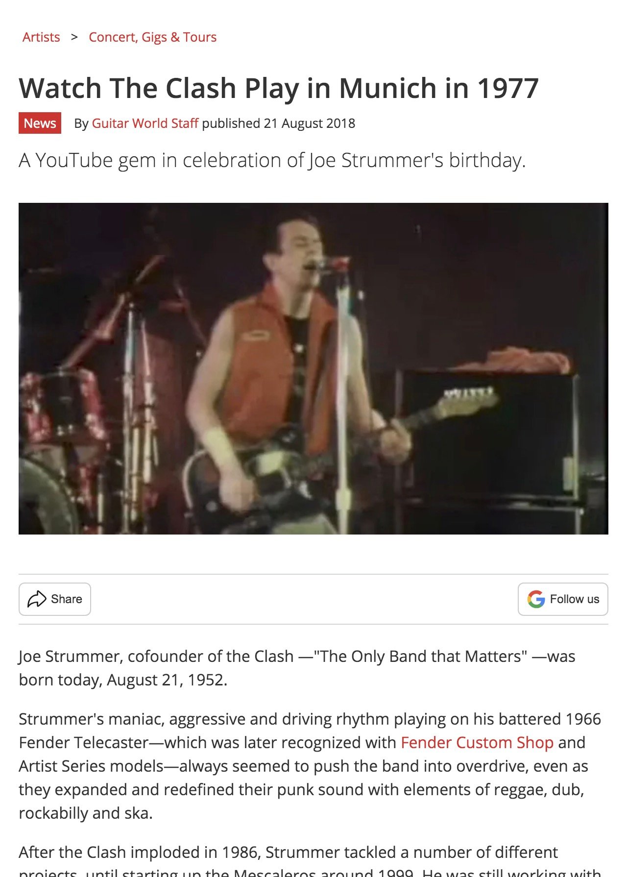 This tribute celebrates the birthday of Joe Strummer , highlighting his aggressive rhythm guitar style on his 1966 Fender Telecaster and his musical evolution from The Clash to The Mescaleros.
